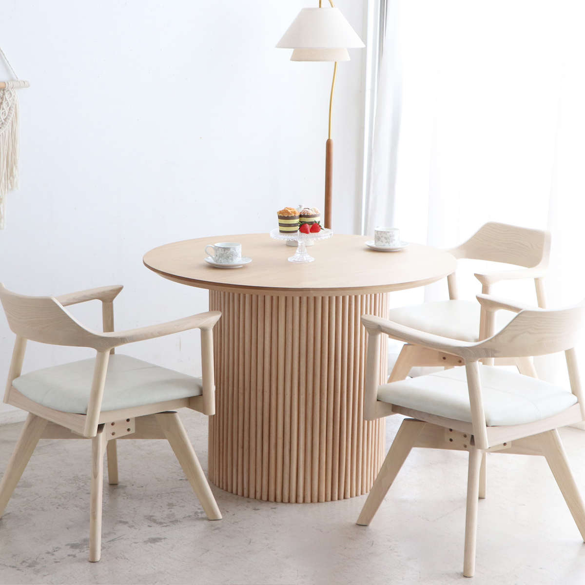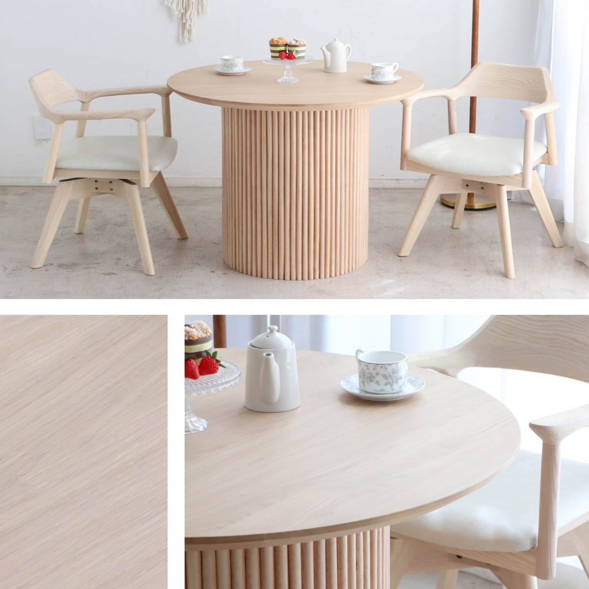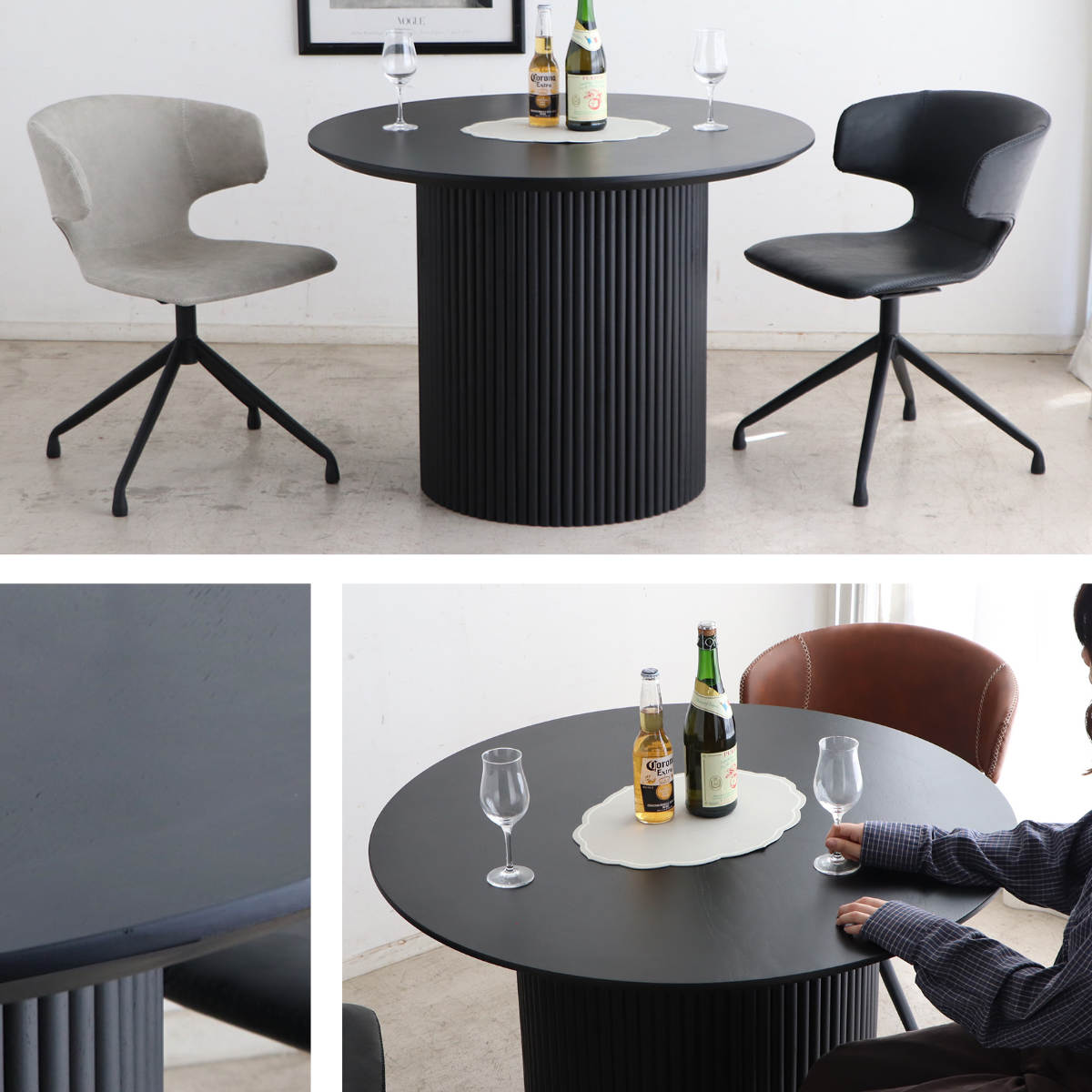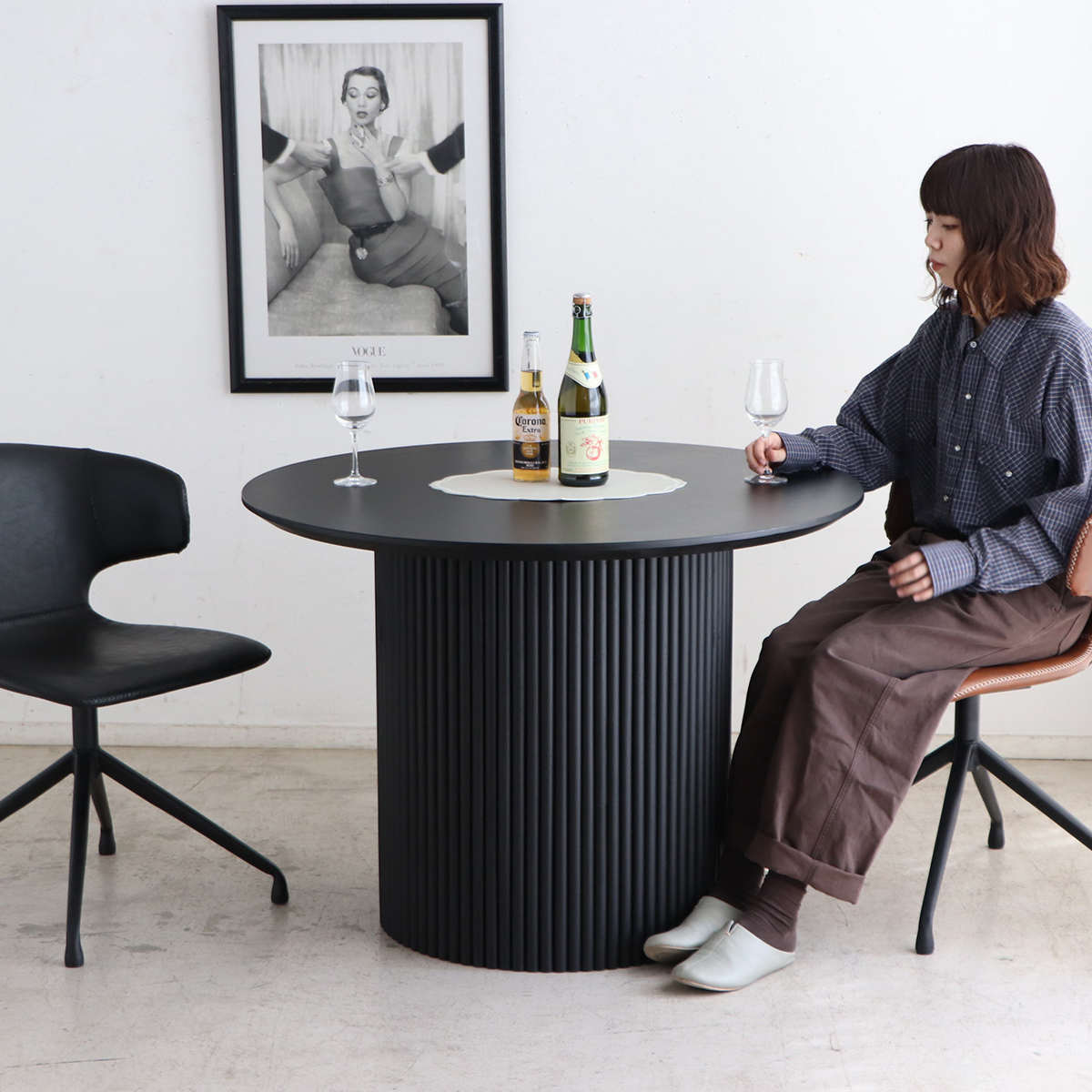 直径100cmの天板は、2人ならゆったり、3人でもほどよい距離感で会話が弾み、4人でも窮屈にならず快適に囲めるサイズです。中央脚デザインでチェアの配置もしやすく、食事からティータイム、作業スペースまで幅広く活躍します。