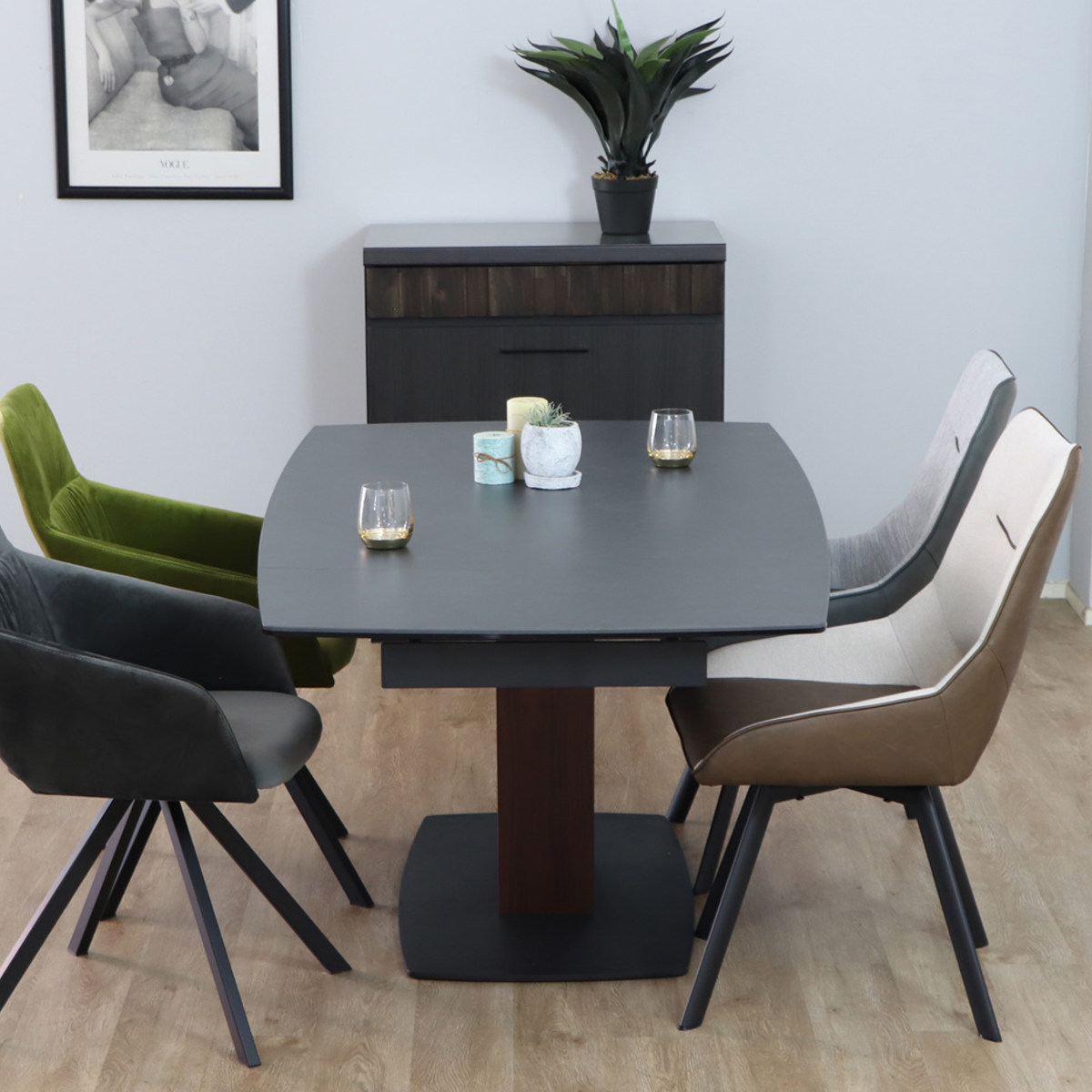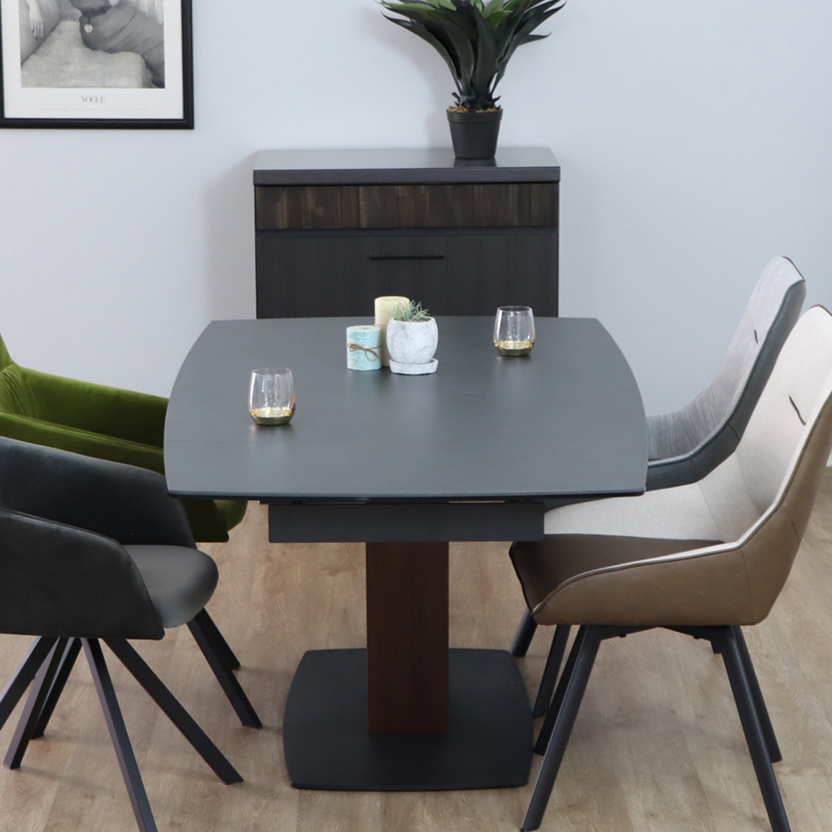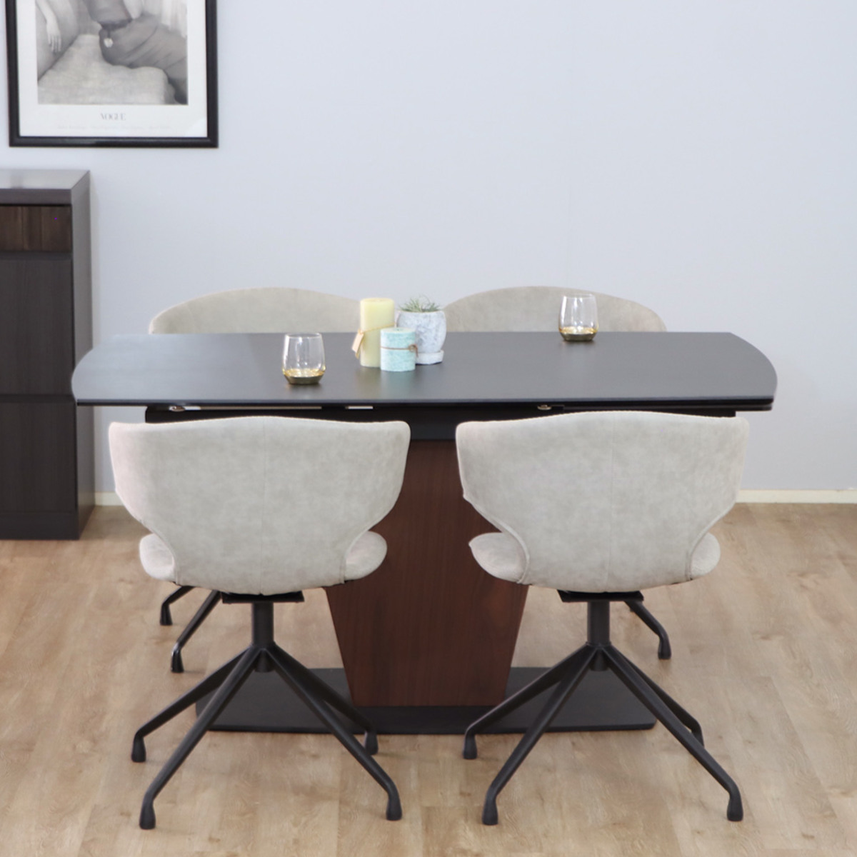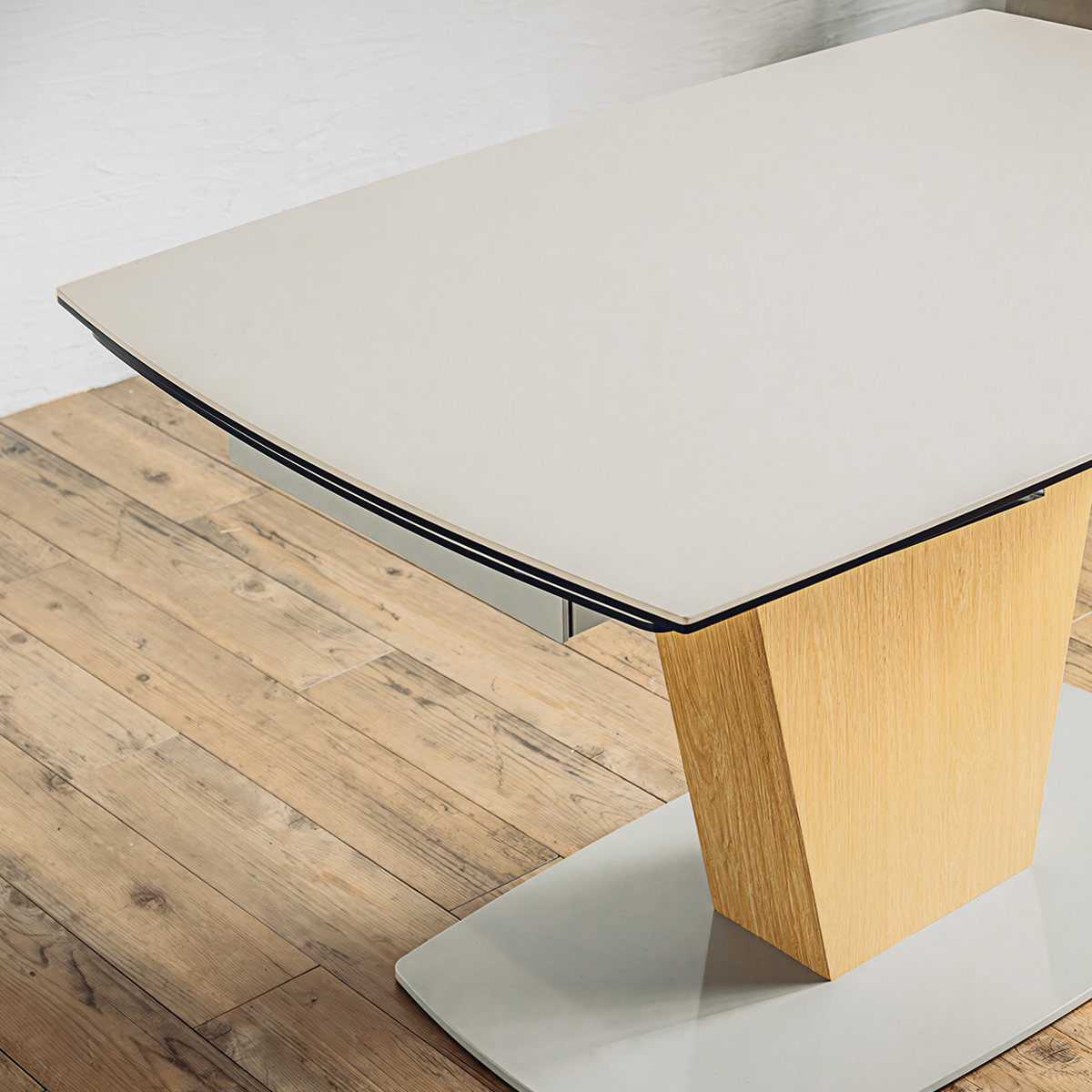 静かで品のある佇まいが、ダイニング空間に格別の存在感をもたらします。マットな質感のセラミック天板は、天然石を思わせる奥行きのある表情を持ち、重厚で落ち着いた印象を演出します。主張しすぎない上品なトーンが、上質な空間づくりに自然と溶け込みます。