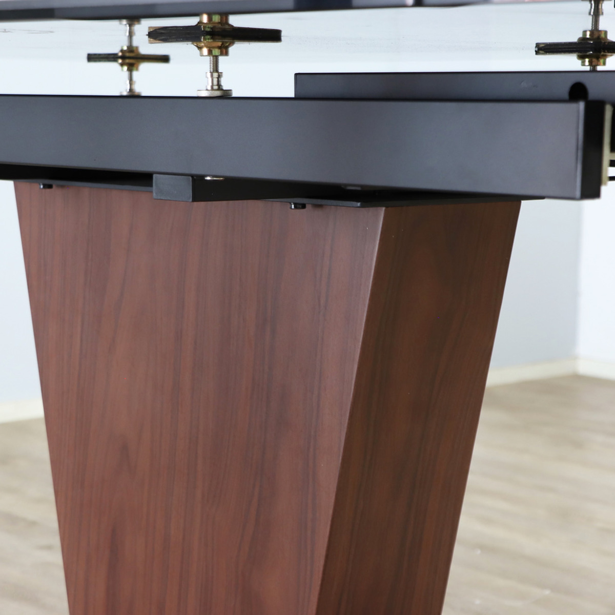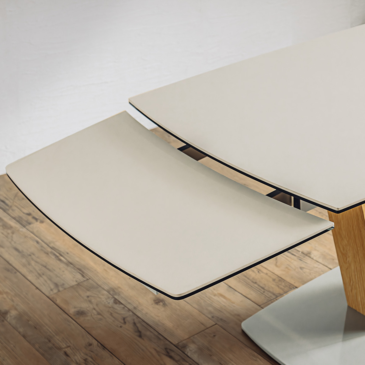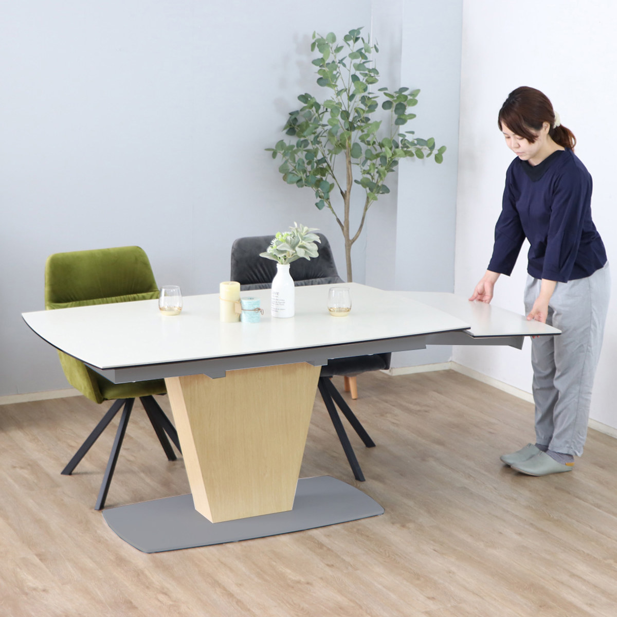 脚部は中央に配置された1本脚タイプ。天板を伸ばした際も脚が干渉しにくく、チェアを自由にレイアウトできます。足元がすっきりとし、開放感のあるダイニング空間を演出します。