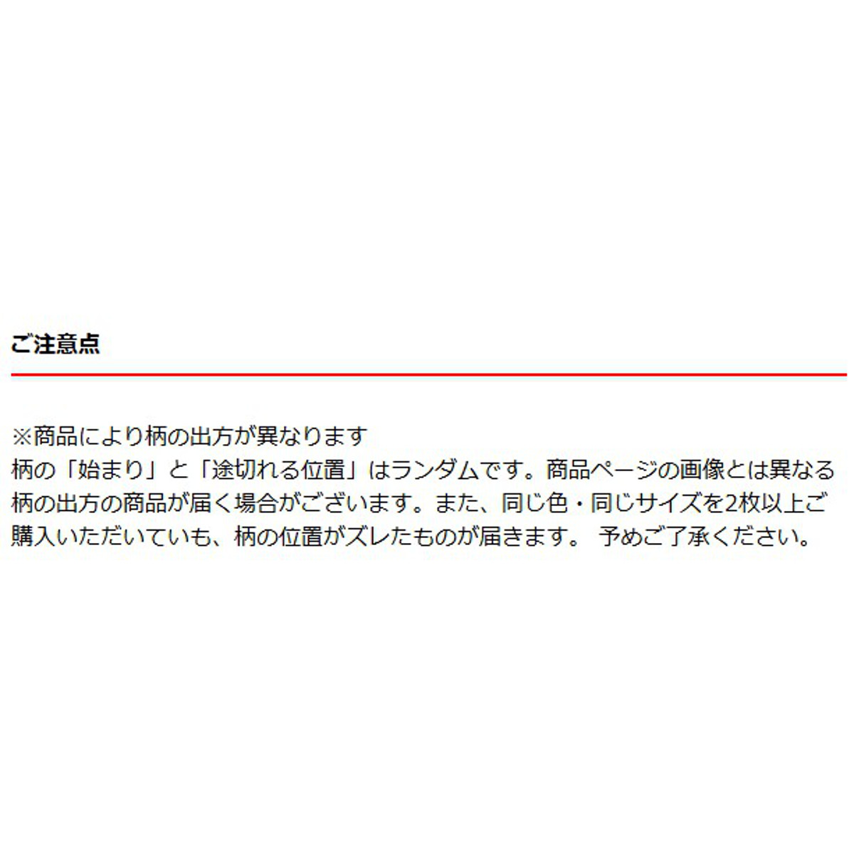 柄の「始まり」と「途切れる位置」はランダムです。商品ページの画像とは異なる柄の出方の商品が届く場合がございます。また、同じ色・同じサイズを2枚以上ご購入いただいていも、柄の位置がズレたものが届きます。予めご了承ください。