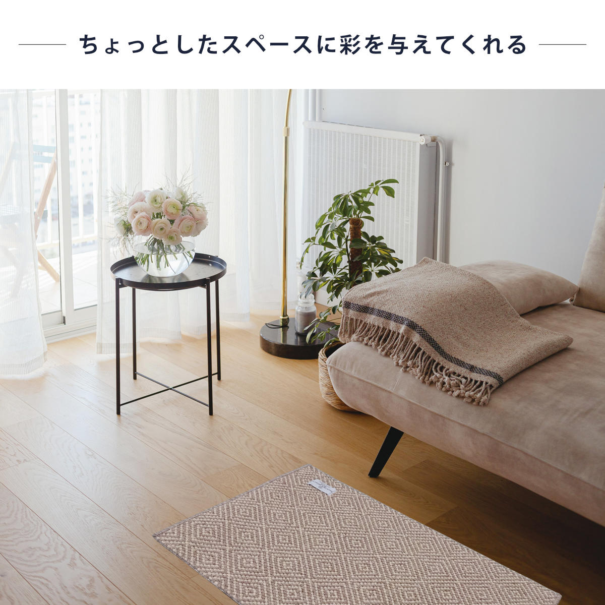 小さめのサイズなので、アクセントラグとしてのご使用もおすすめです。リビングやダイニング、キッチン、バスルーム、トイレルームなどのちょっとしたスペースにもぴったりです。ライフスタイルに合わせて様々なシーンでお使いいただけます。