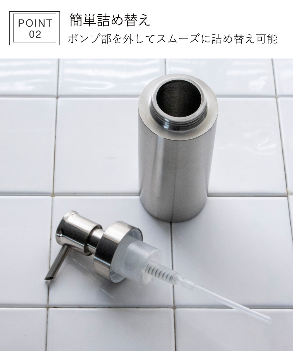 ポンプ部を外して注ぐだけの簡単詰め替えなので、手間なく気軽に補充できます。