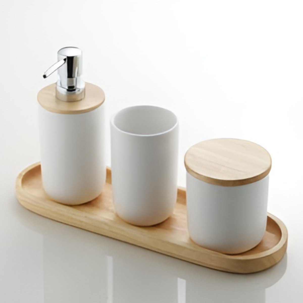 木のフタと陶器の組み合わせがやさしく調和し、シンプルながらも存在感のあるデザインに仕上げました。詰め替えるだけで生活感を隠し、洗面台やキッチンがすっきりと美しく整います。