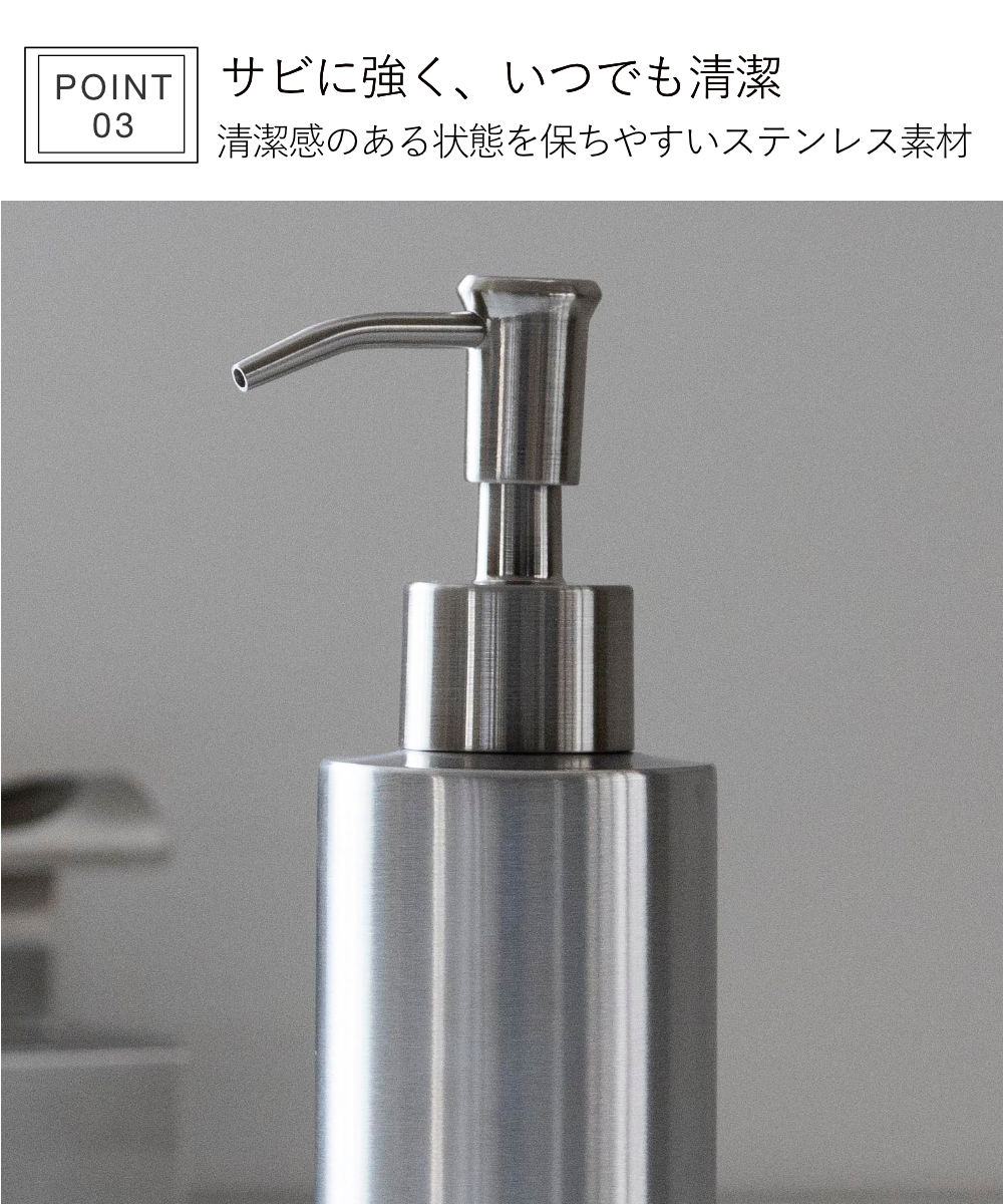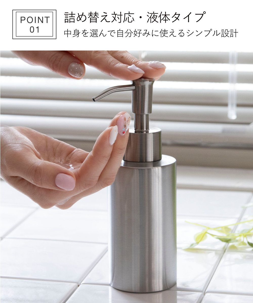 ハンドソープや化粧水・乳液など、洗面用アイテムに幅広く対応。お気に入りのアイテムを詰め替えて、自分好みにご使用いただけます。