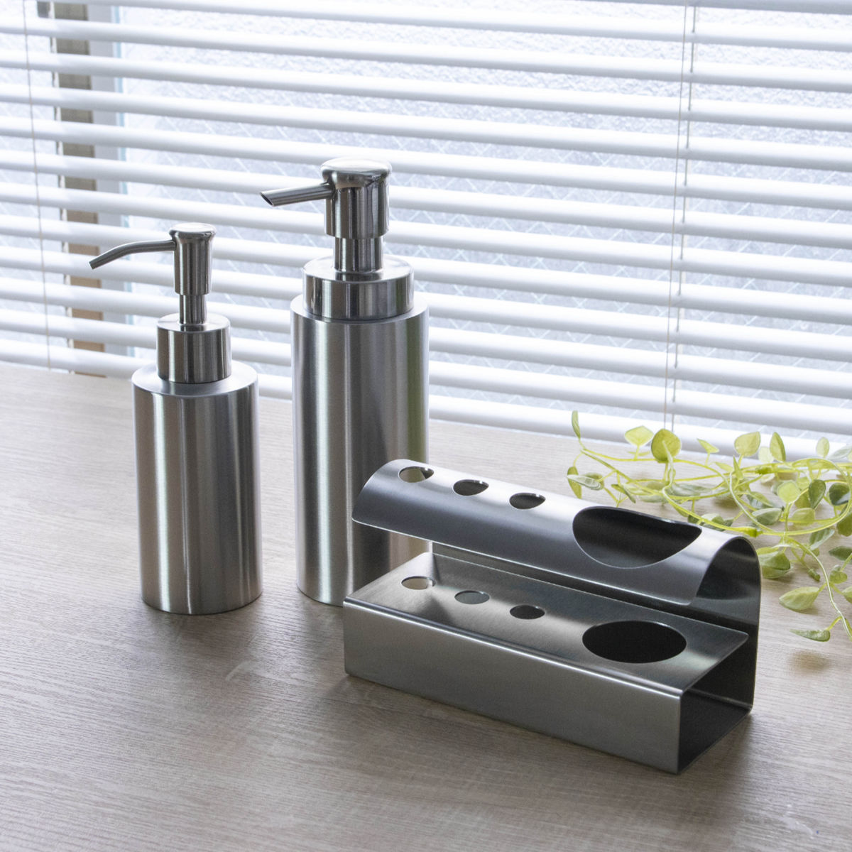 同シリーズで揃えることで、洗面まわりに統一感が生まれます。無駄のないステンレスの佇まいが空間をスッキリと見せ、清潔感のある印象に。