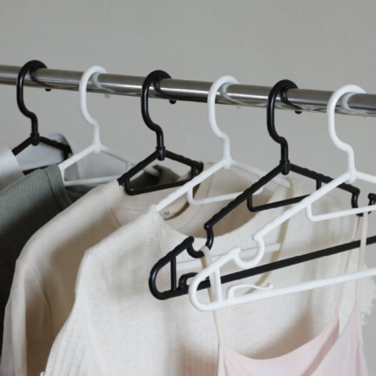 実用性とアイデアを詰め込んだハンガー10本セットです。ハンガーフックはターン式を採用。角度を自由に調整できるので、物干し竿や室内のバーなど、場所を問わず掛けやすく設計されています。干すときも収納するときもスムーズに使えます。