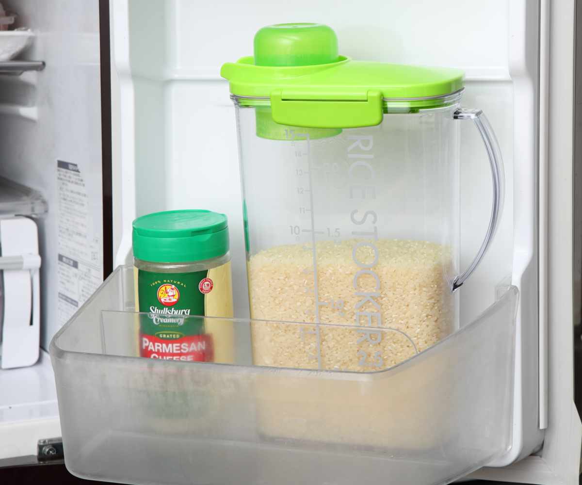 冷蔵庫のドアポケットにスッキリ収納できる米びつ