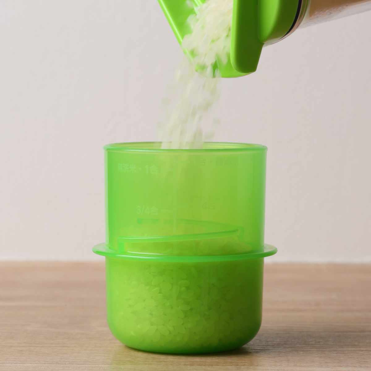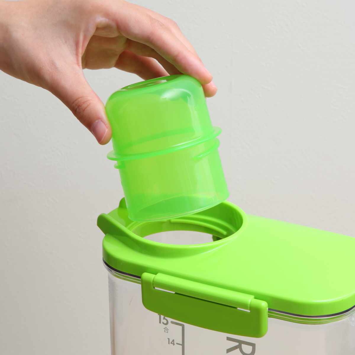 フタは無洗米・普通米対応の計量カップになっており、冷蔵庫から取り出してすぐに計量できます。注ぎ口は計量カップに入れやすい形状で、こぼれにくいです。