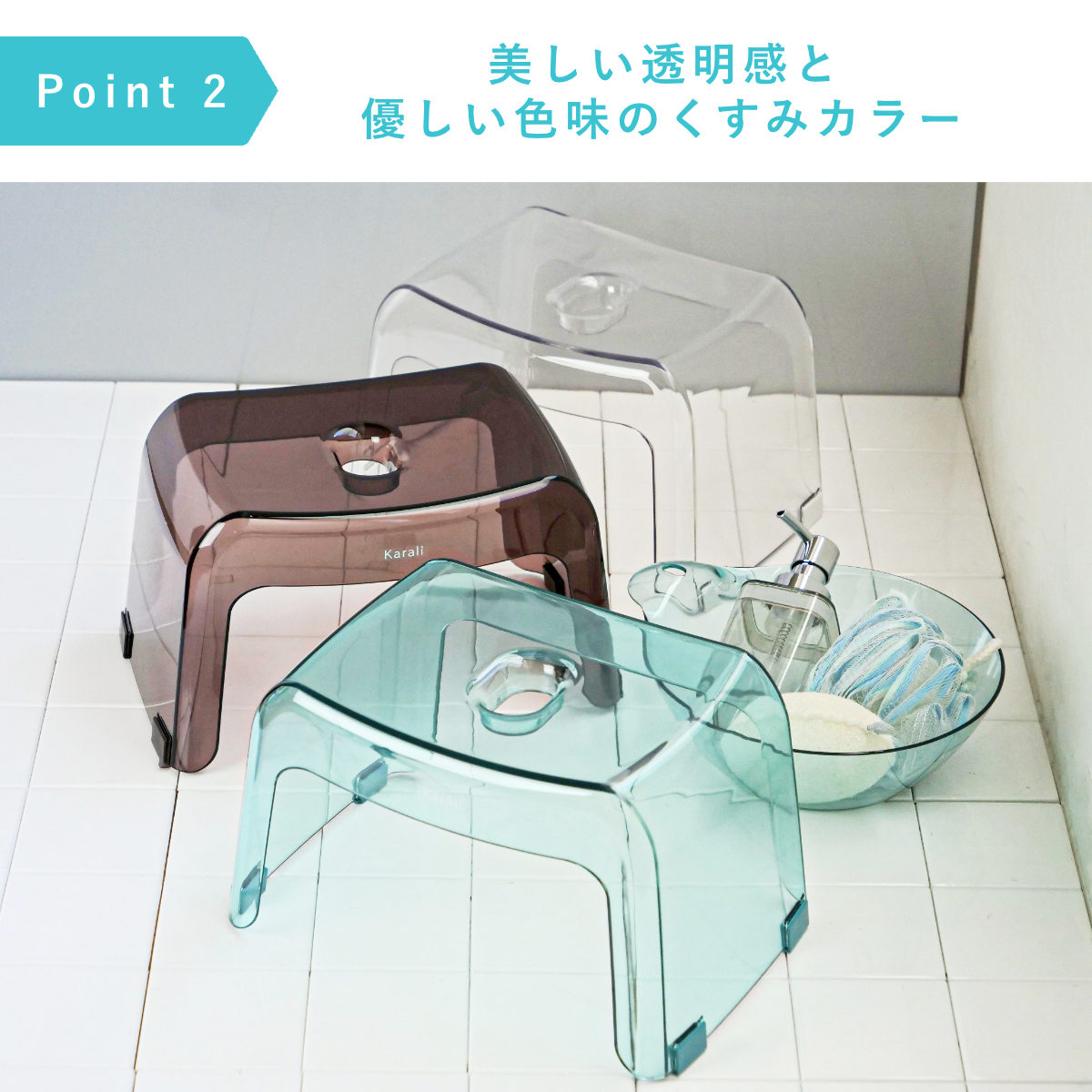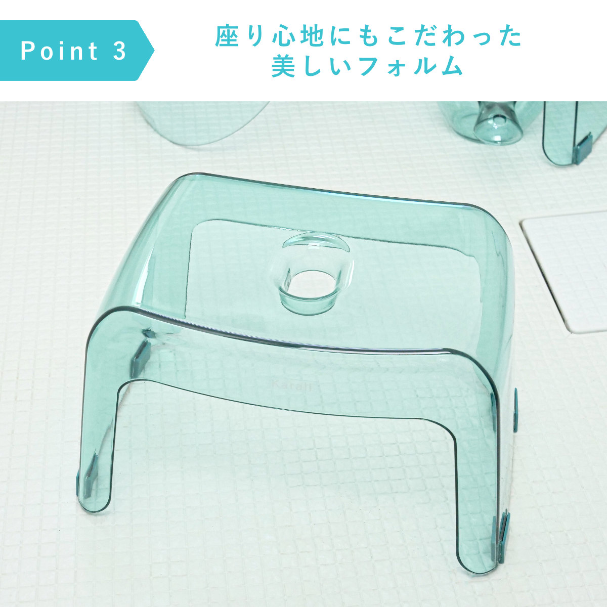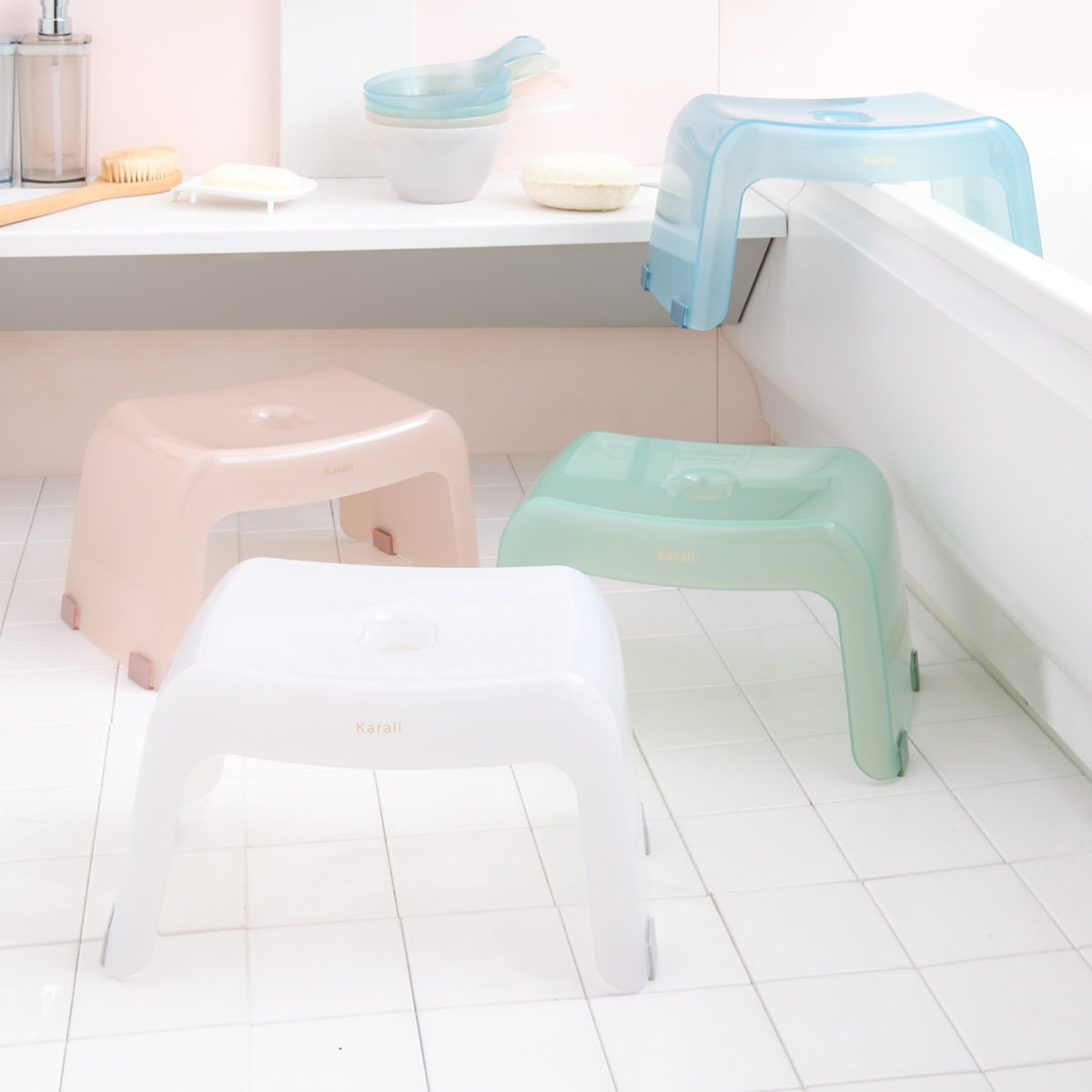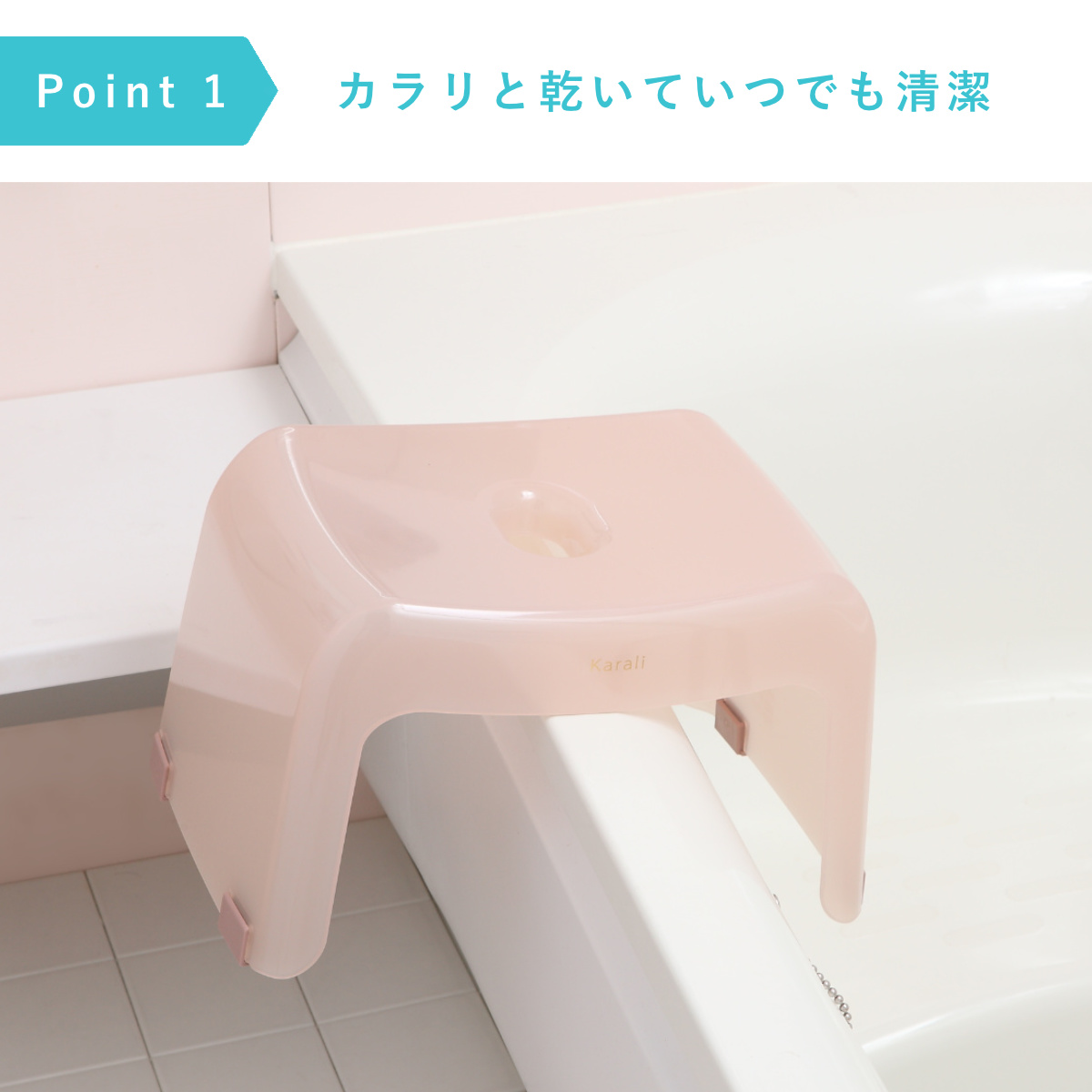 美しいデザインだけでなく扱いやすさを考えたバスシリーズ「カラリ」の風呂椅子です。浴槽のヘリに掛けて乾かすことができ、お手入れが簡単です。通気性が良い設計になってるので、空気が流れやすく湿気がこもりません。