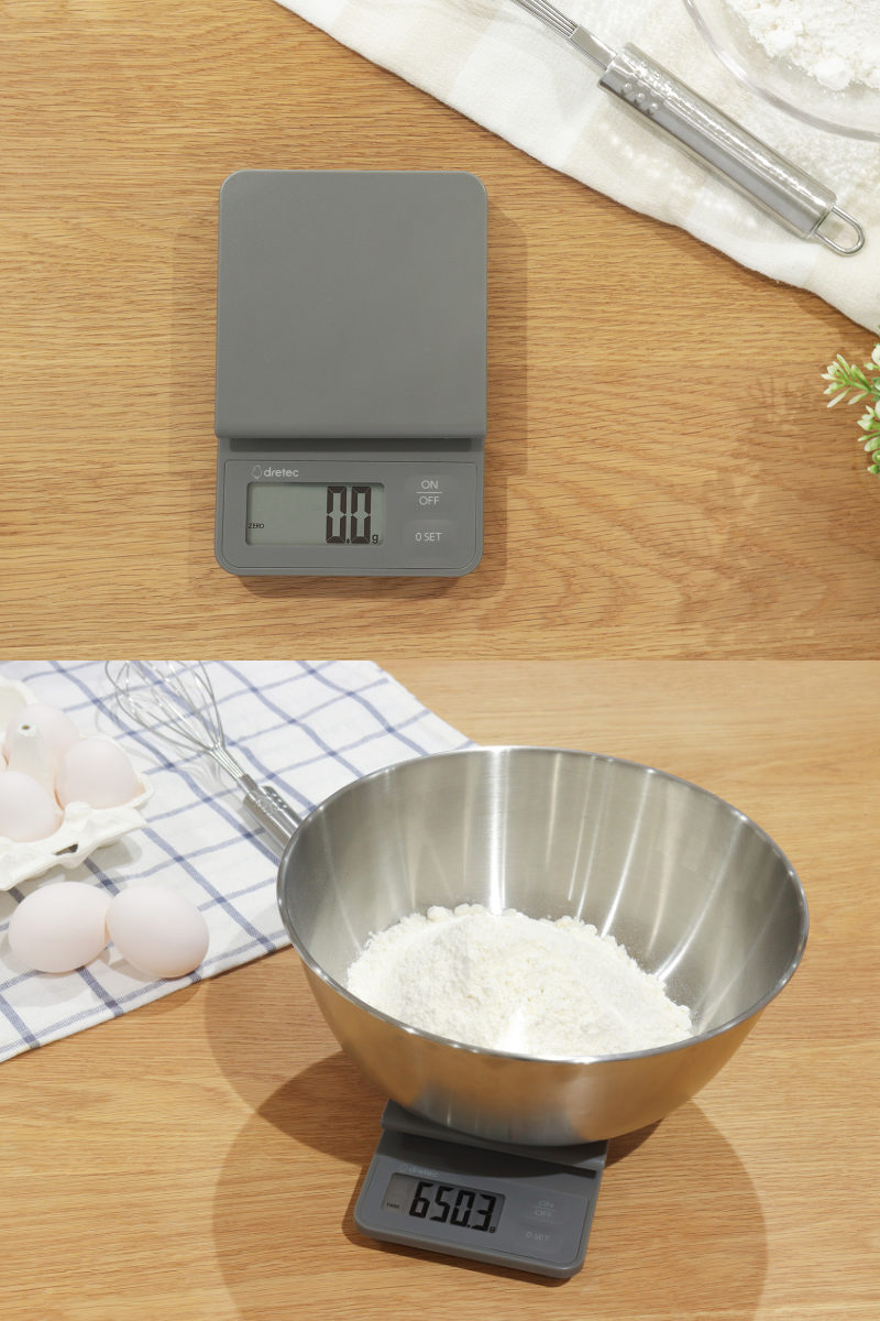 0SETボタンで、容器の重さを差し引いて計量(風袋引き計量)や計量のたびに0表示にして連続計量することも可能です。材料を追加しながら量れるので、お菓子作りや調味料の調合に便利です。