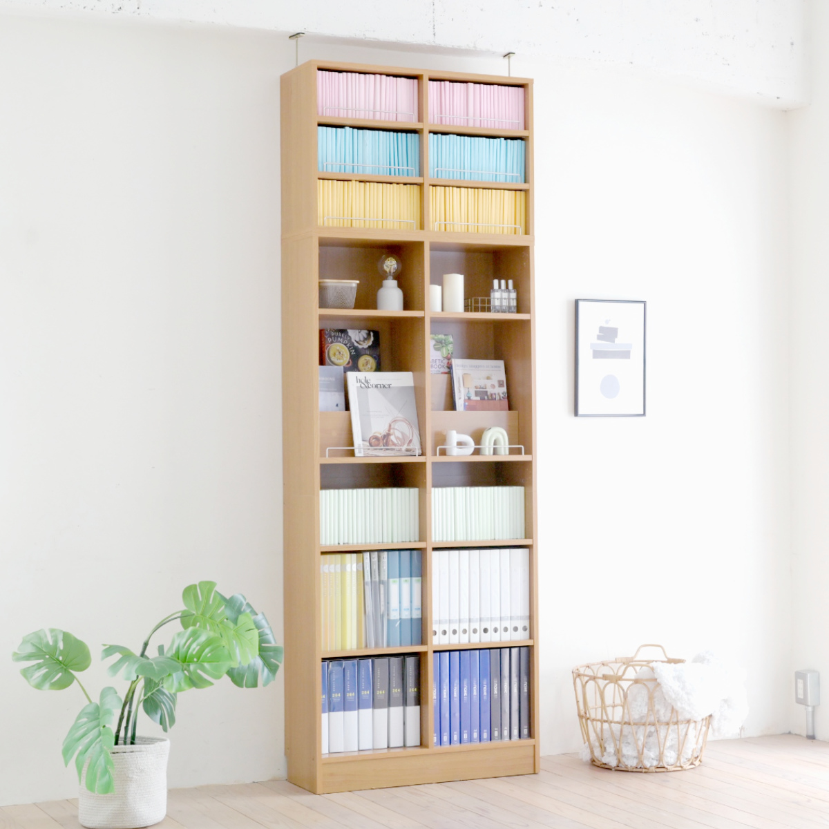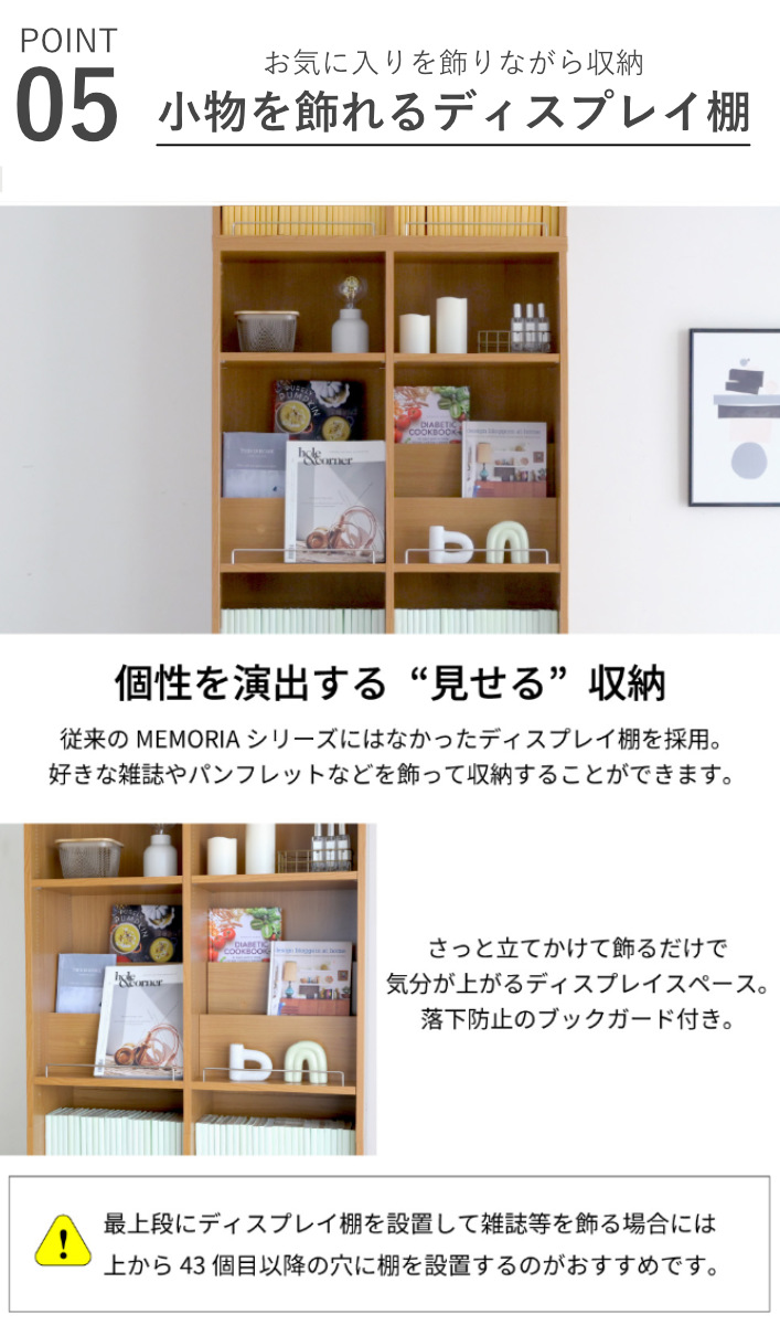 1cmピッチで棚の高さを細かく調節できる本棚です。小さな文庫本から大きな図鑑まで、幅広いサイズの本を無駄なく収納することができます。表紙を見せて飾りたい雑誌やお気に入りの小物をディスプレイできるスペース付きで、自由にレイアウトを楽しめます。