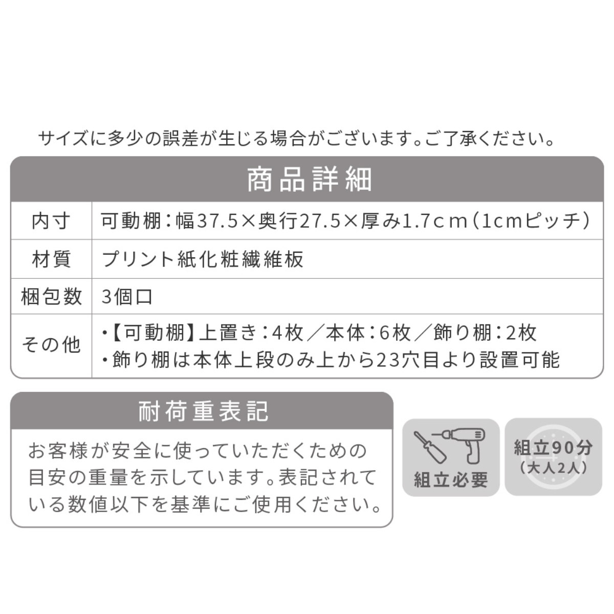 | 内容量 | 1台 付属品:転倒防止金具、可動棚10枚(上置き棚4枚、本体6枚)、飾り棚2枚 |