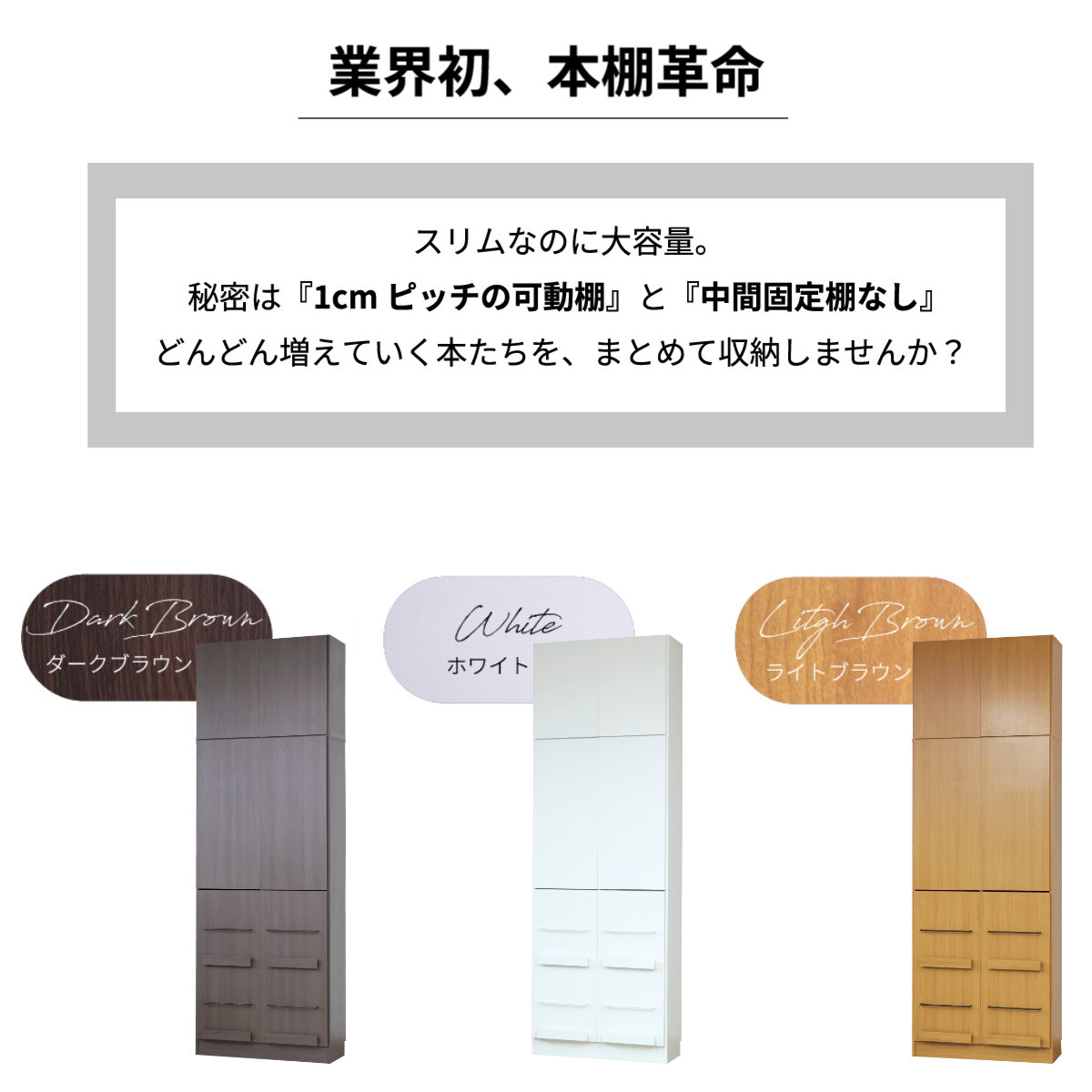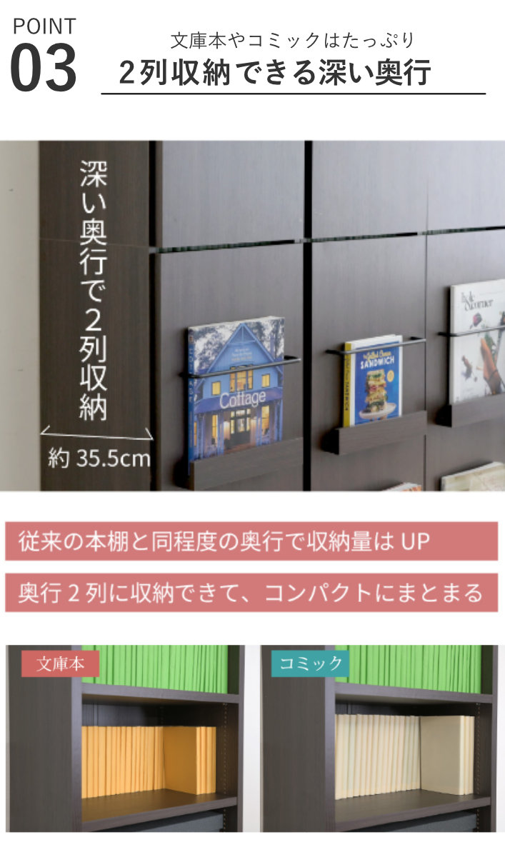 1cmピッチで棚の高さを細かく調節できる本棚です。小さな文庫本から大きな図鑑まで、幅広いサイズの本を無駄なく収納することができます。表紙を見せて飾りたい雑誌やお気に入りの小物をディスプレイできるスペース付きで、自由にレイアウトを楽しめます。