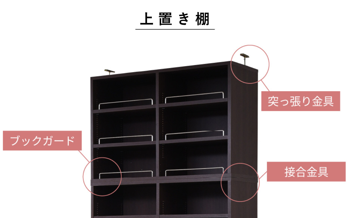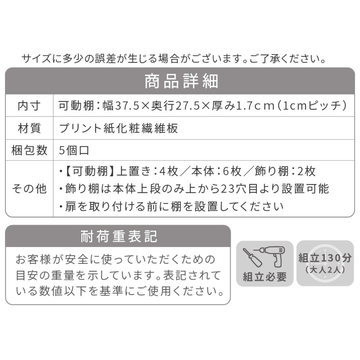 | 内容量 | 1台 付属品:転倒防止金具、可動棚10枚(上置き棚4枚、本体6枚)、飾り棚2枚 |