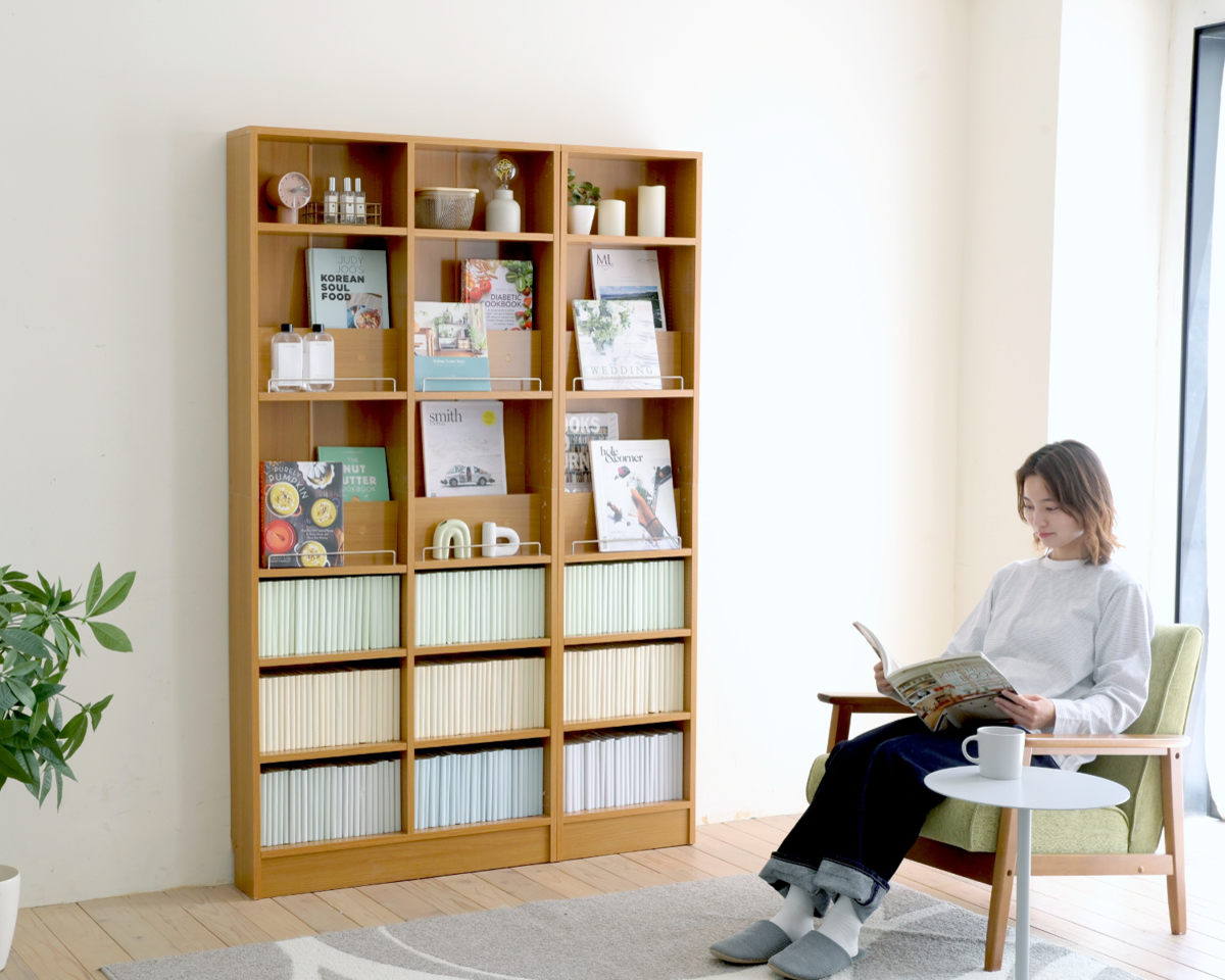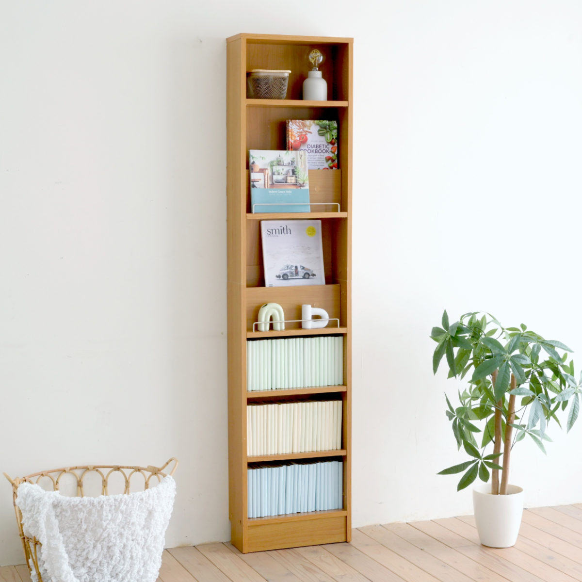 1cmピッチで棚の高さを細かく調節できる本棚です。小さな文庫本から大きな図鑑まで、幅広いサイズの本を無駄なく収納することができます。表紙を見せて飾りたい雑誌やお気に入りの小物をディスプレイできるスペース付きで、自由にレイアウトを楽しめます。