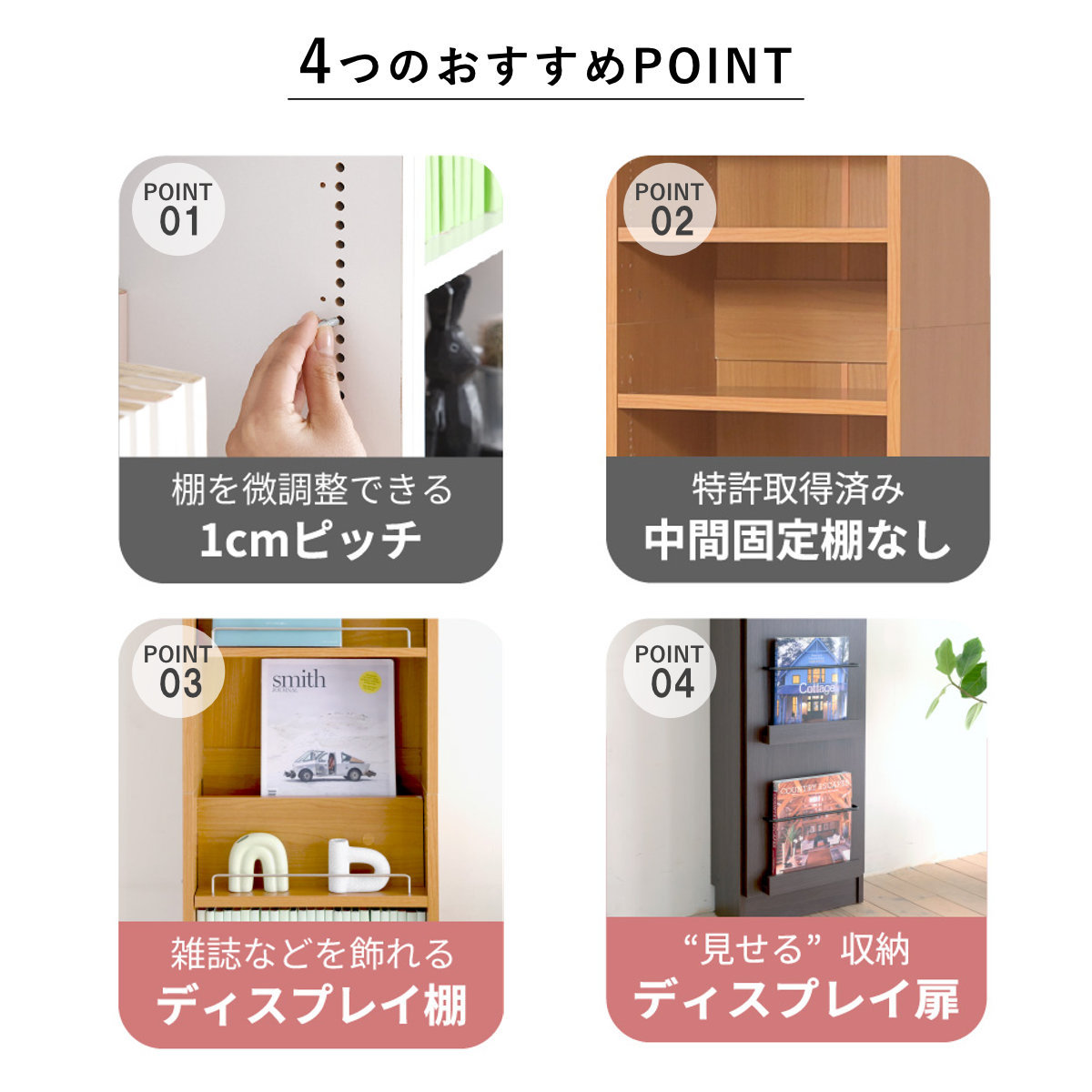 1cmピッチで棚の高さを細かく調節できる本棚です。小さな文庫本から大きな図鑑まで、幅広いサイズの本を無駄なく収納することができます。表紙を見せて飾りたい雑誌やお気に入りの小物をディスプレイできるスペース付きで、自由にレイアウトを楽しめます。
