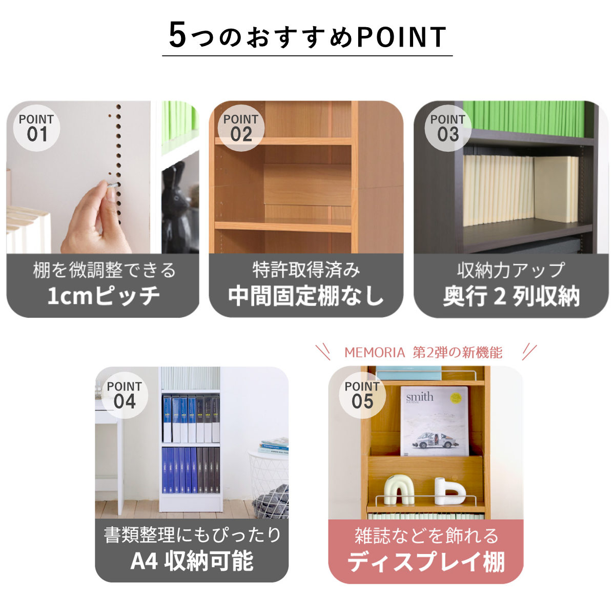 1cmピッチで棚の高さ調節OK!「飾る」と「しまう」ができる本棚
