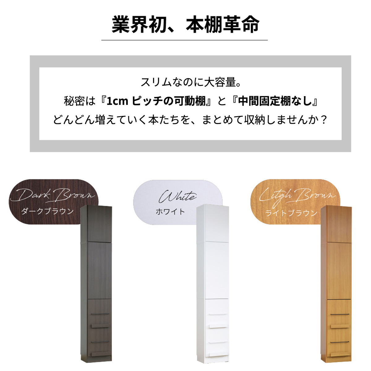 1cmピッチで棚の高さを細かく調節できる本棚です。小さな文庫本から大きな図鑑まで、幅広いサイズの本を無駄なく収納することができます。表紙を見せて飾りたい雑誌やお気に入りの小物をディスプレイできるスペース付きで、自由にレイアウトを楽しめます。