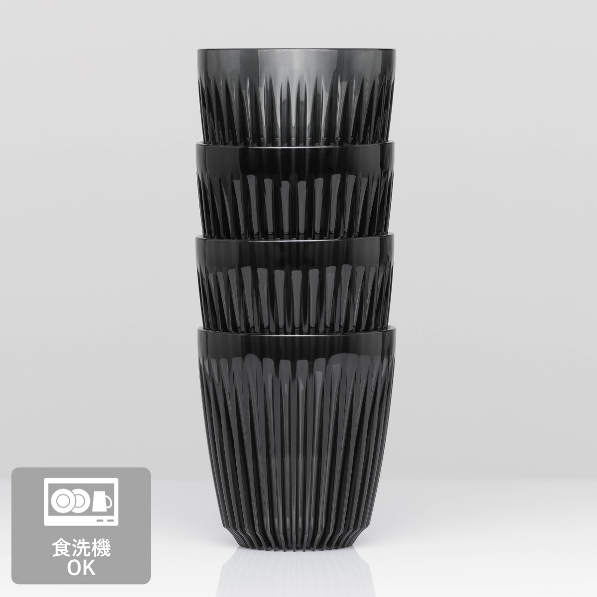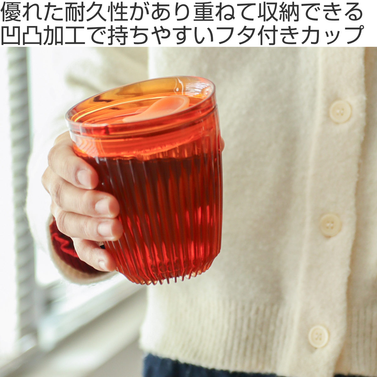 フィンと呼ばれる凹凸の表面加工がスタイリッシュな見た目と持ちやすさを実現し、ホットドリンクを入れても取っ手なしで持ちやすい設計です。