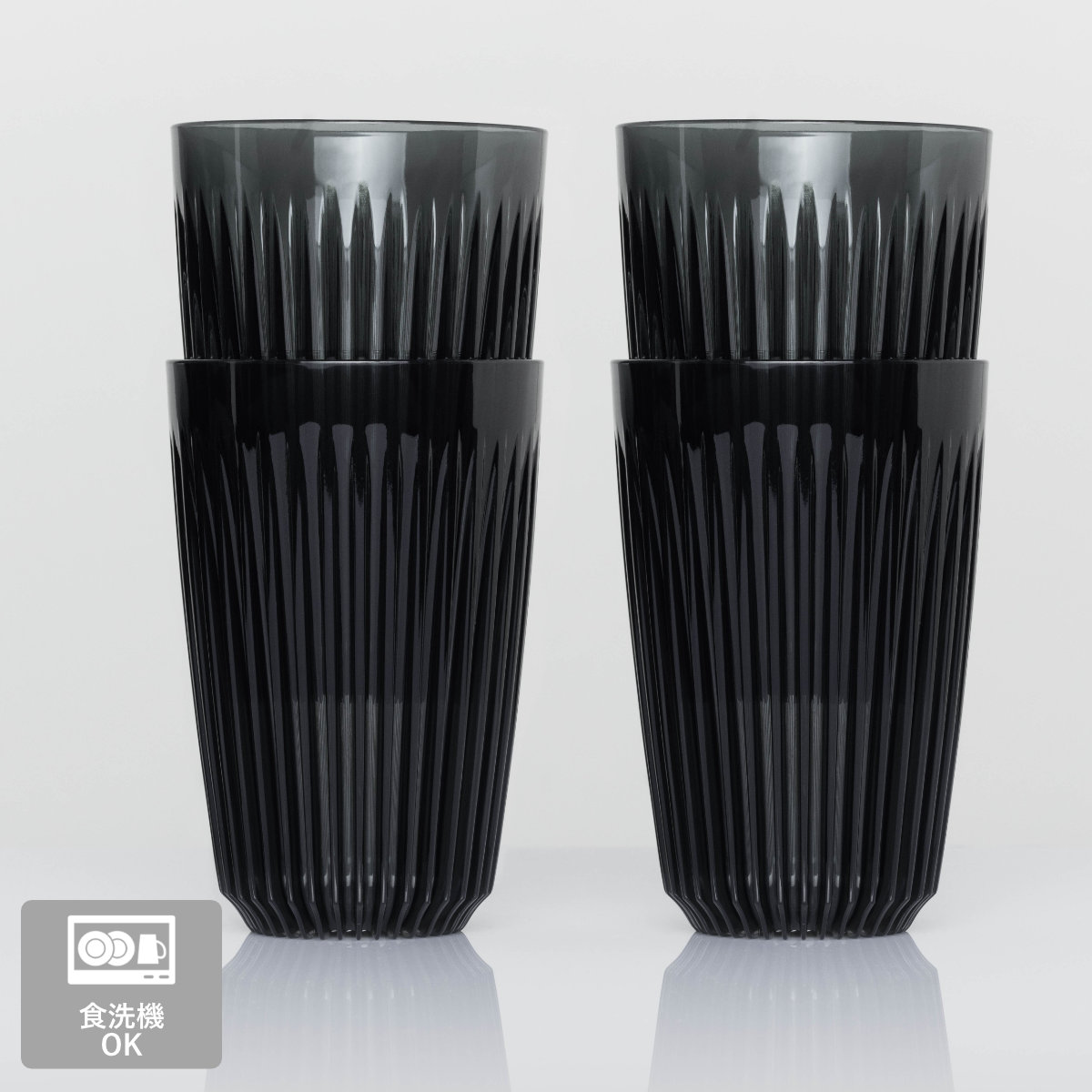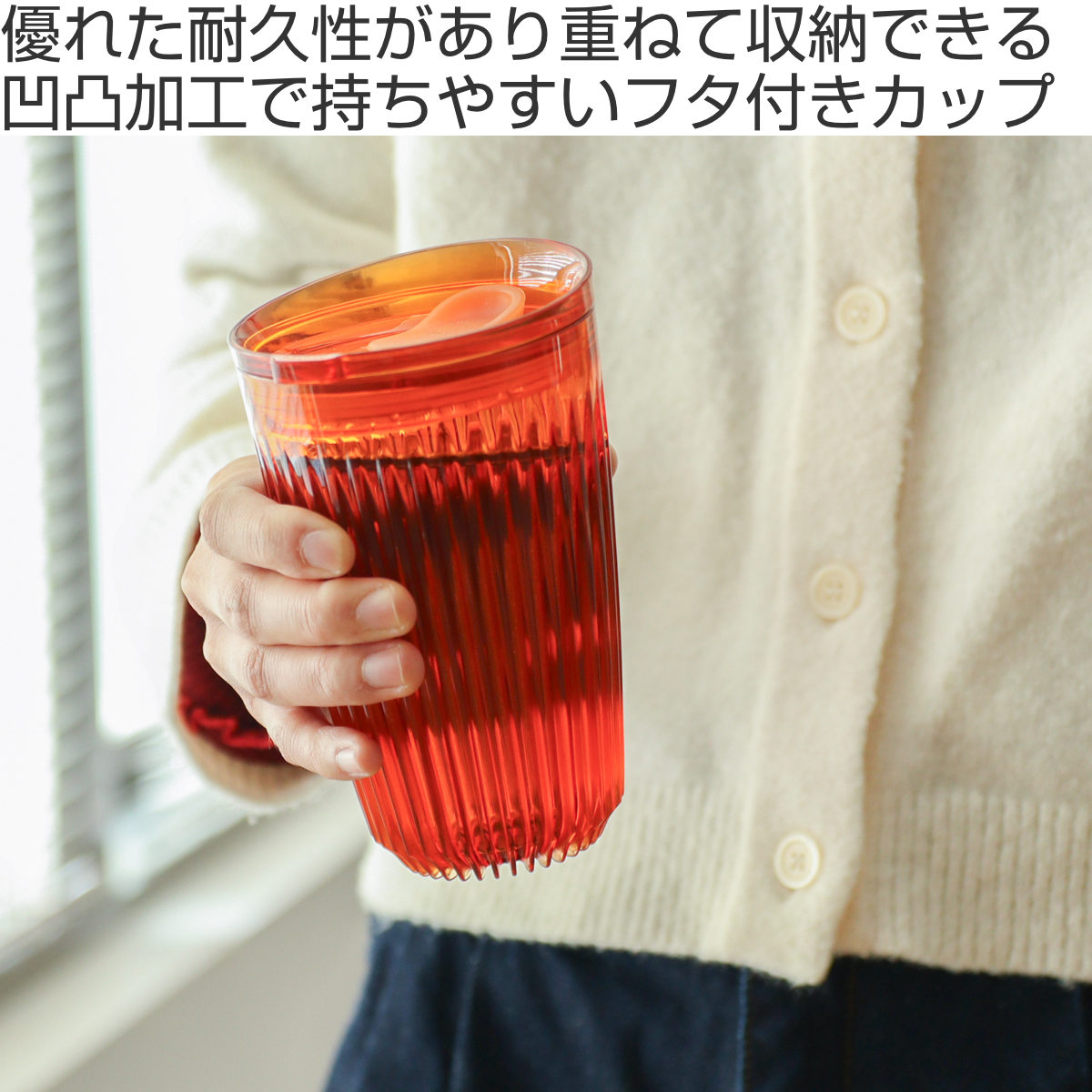 フィンと呼ばれる凹凸の表面加工がスタイリッシュな見た目と持ちやすさを実現し、ホットドリンクを入れても取っ手なしで持ちやすい設計です。