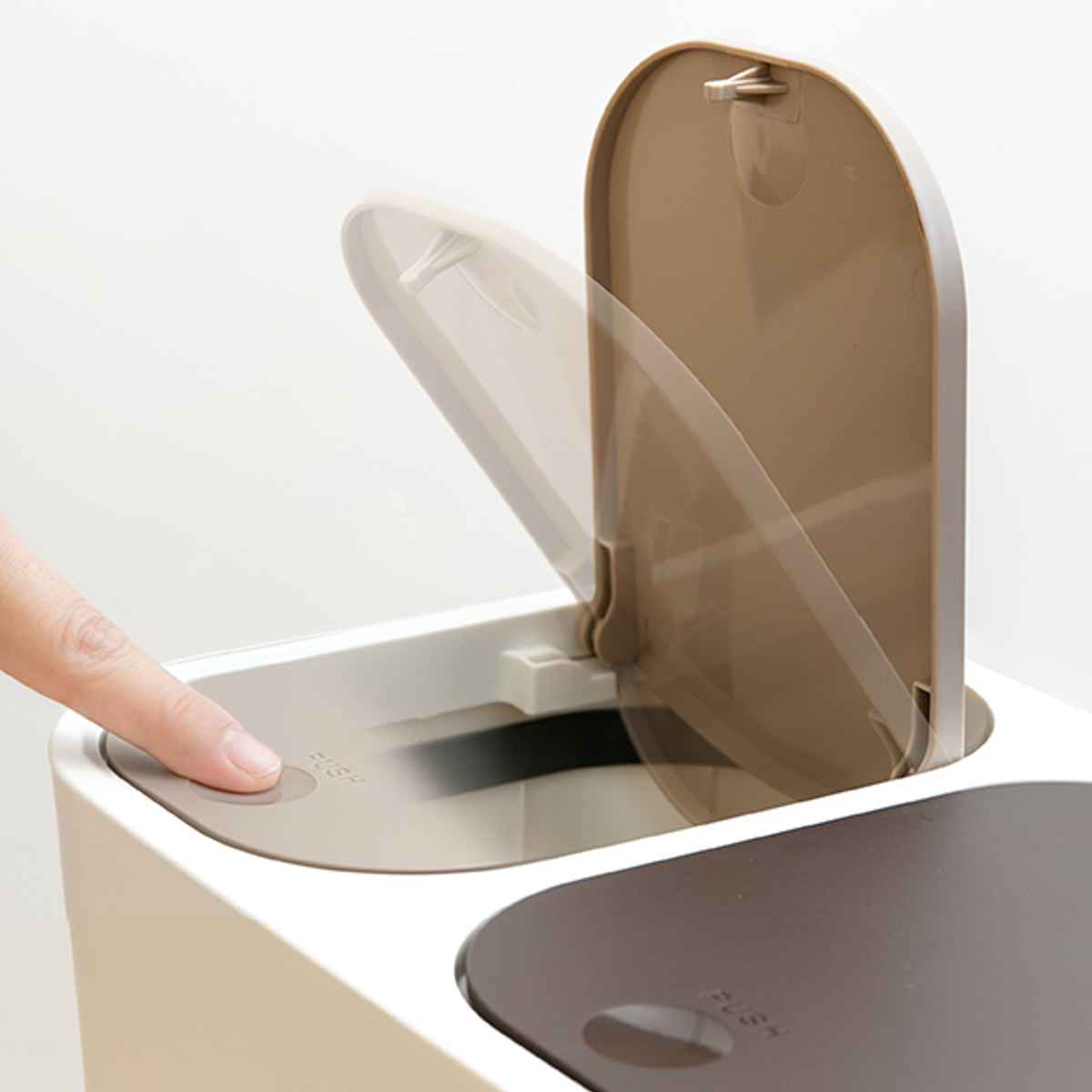 片手でラクラク、ワンタッチ開閉のプッシュフタは軽く押すだけで簡単にゴミ捨てができます。フタ付きなので、小さなお子様やペットのイタズラを未然に防げます。