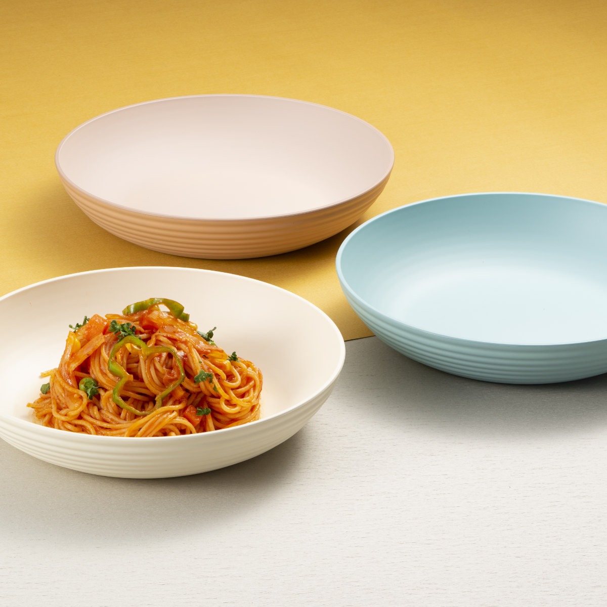 樹脂製で軽くて割れにくく、毎日の食卓で使いやすい深皿です。表面には抗菌加工を施しているため、細菌の増殖を抑え、毎日の食事を衛生的にサポートします。パスタ・カレー・シチュー・煮込み料理はもちろん、サラダや主菜のおかずまで幅広く使える万能サイズです。程よい深さがあるため、ソースやドレッシングがこぼれにくく、見た目もきれいに仕上がります。