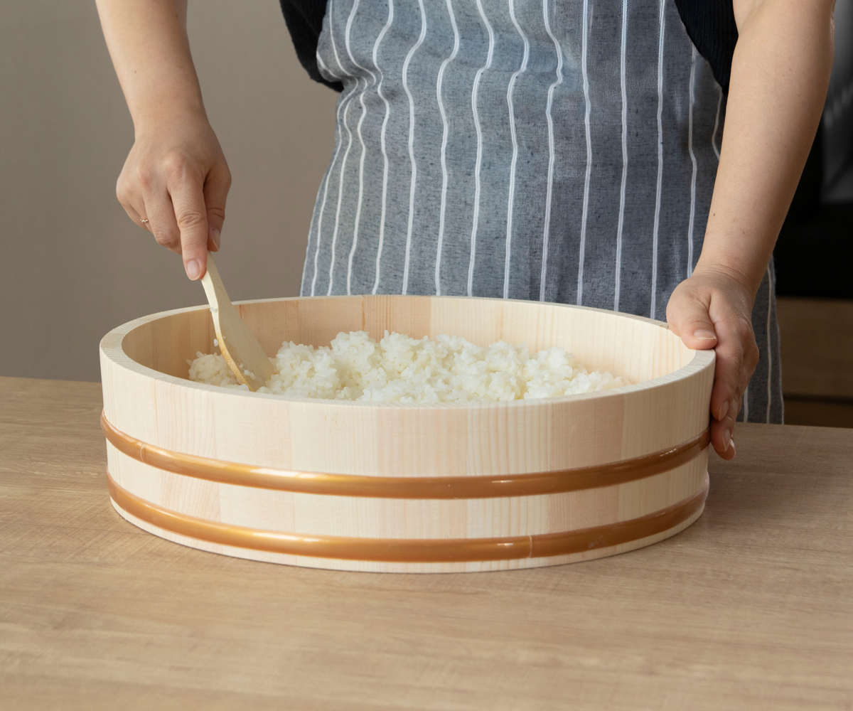 天然木が余分な水分を吸い取るので、ベタつかず美味しい寿司飯ができます。木ならではの優れた保湿性と断熱性で、時間が経っても酢飯の乾燥を防いで程よい温度を保ちます。