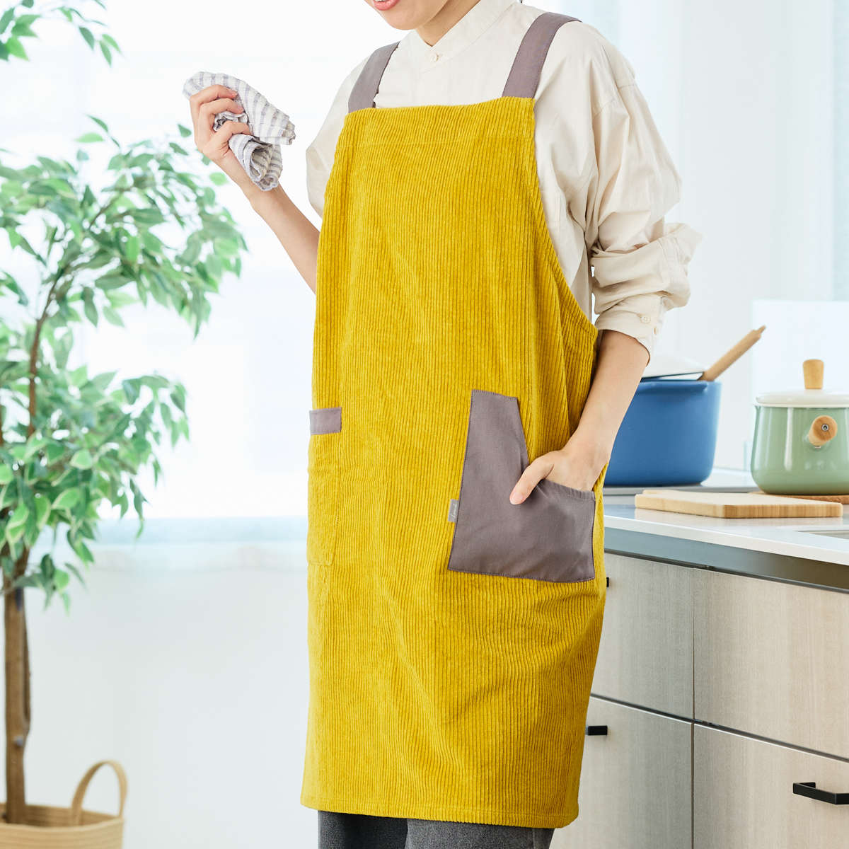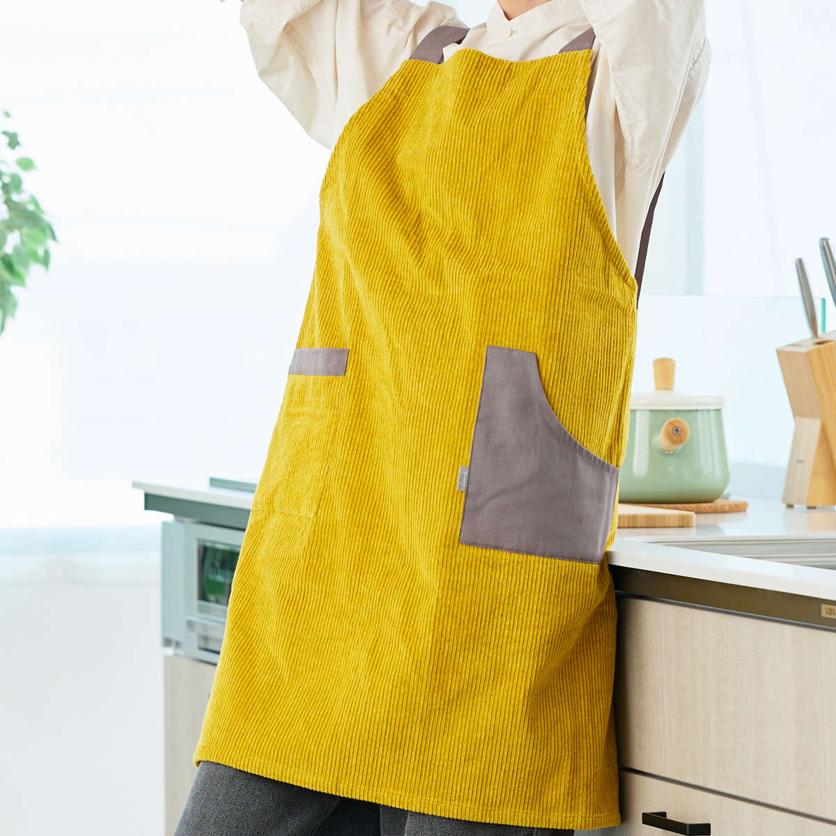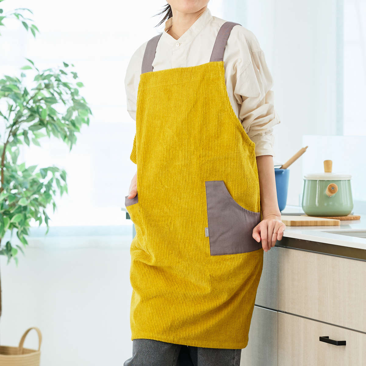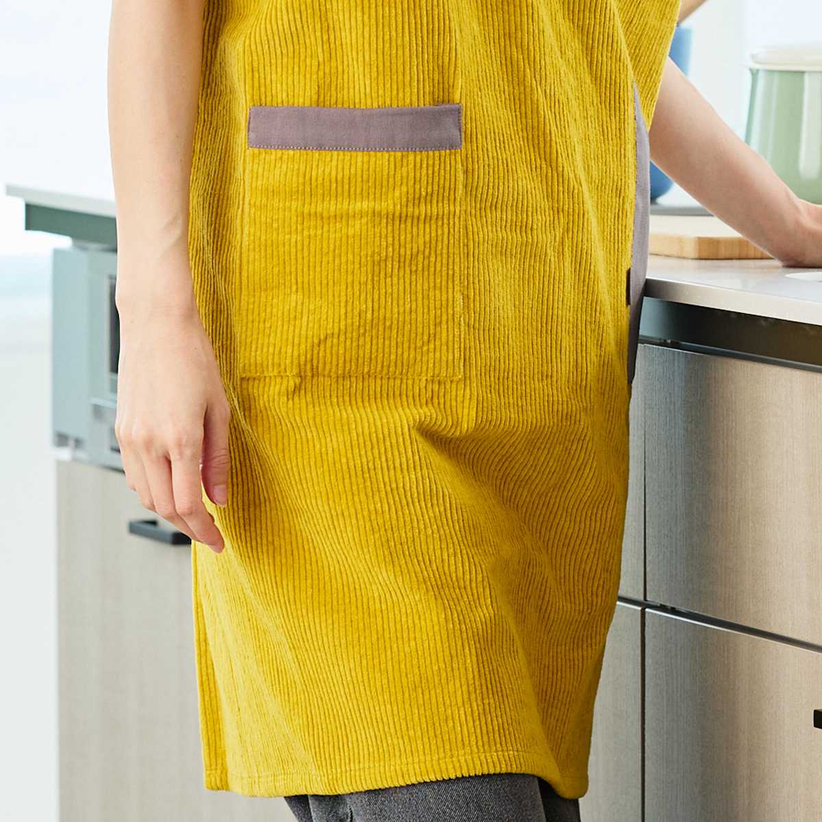 手触りの良いコーデュロイ素材を使用した、心地よく着られるエプロンです。毎日使っても飽きのこない、シンプルながら洗練されたデザインです。バイカラーの配色が、おしゃれなアクセントになっています。