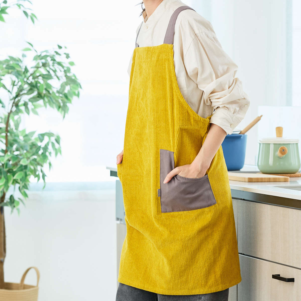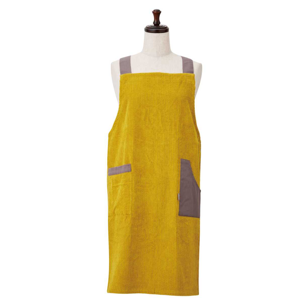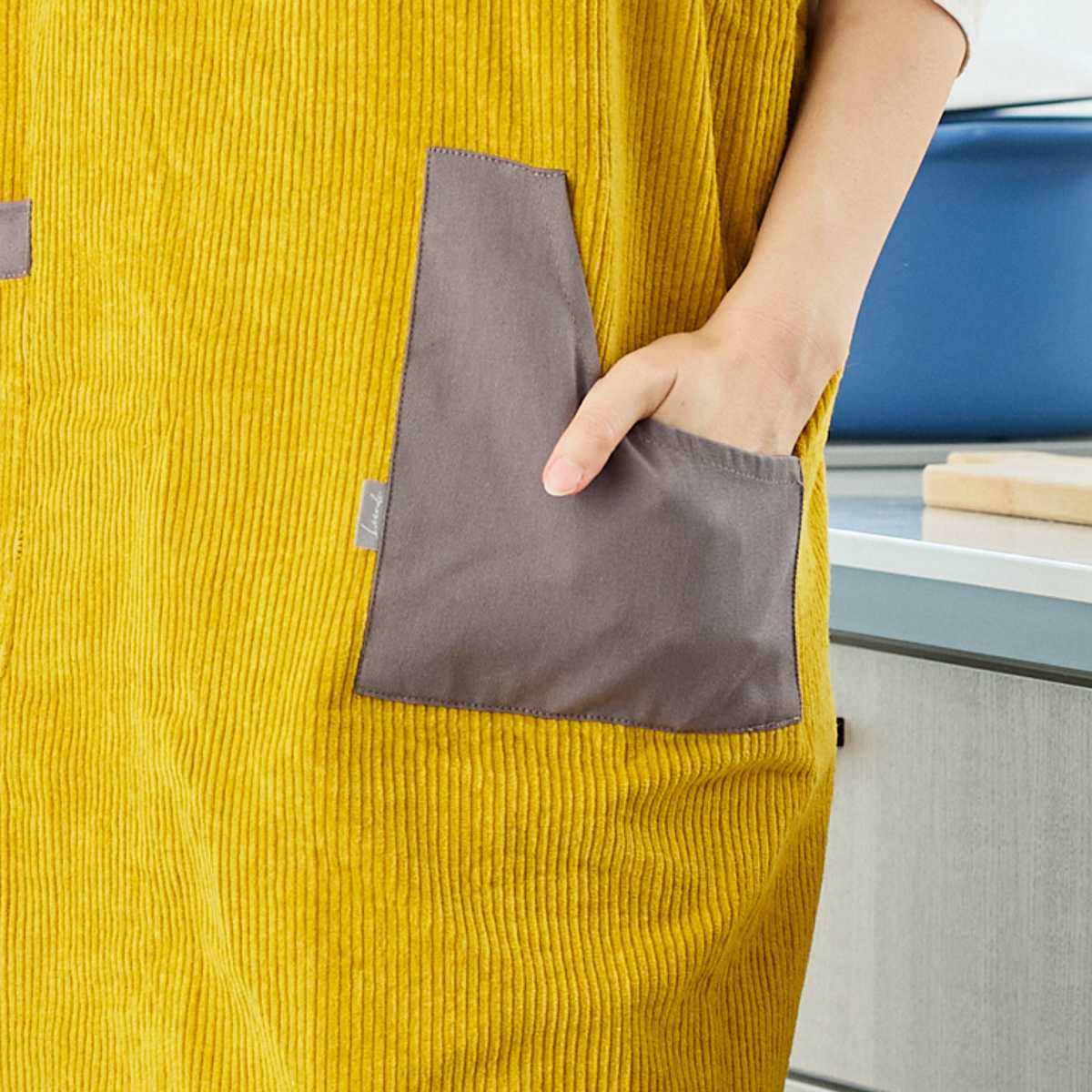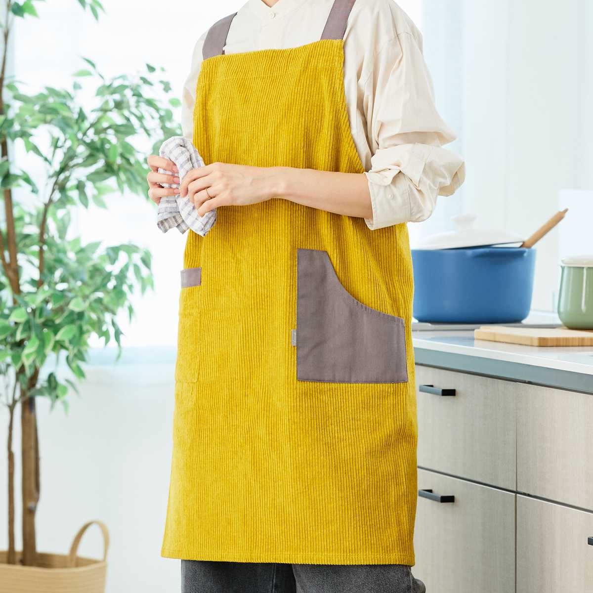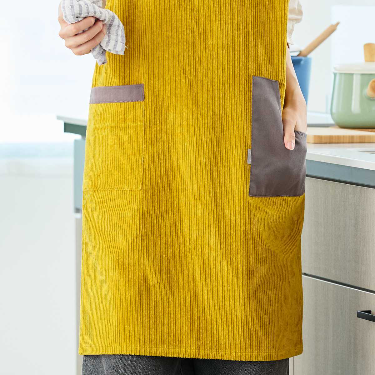 手触りの良いコーデュロイ素材を使用した、心地よく着られるエプロンです。毎日使っても飽きのこない、シンプルながら洗練されたデザインです。バイカラーの配色が、おしゃれなアクセントになっています。