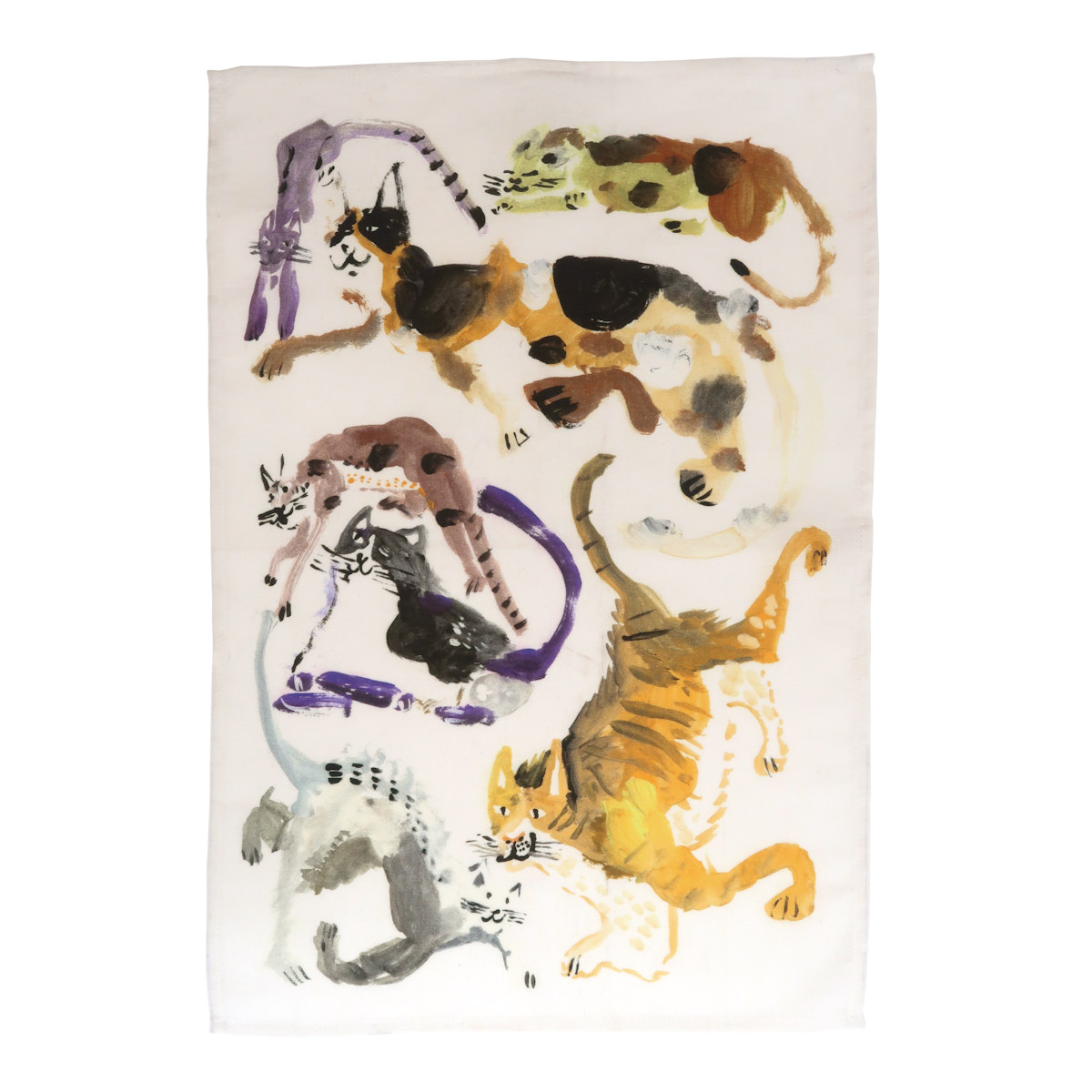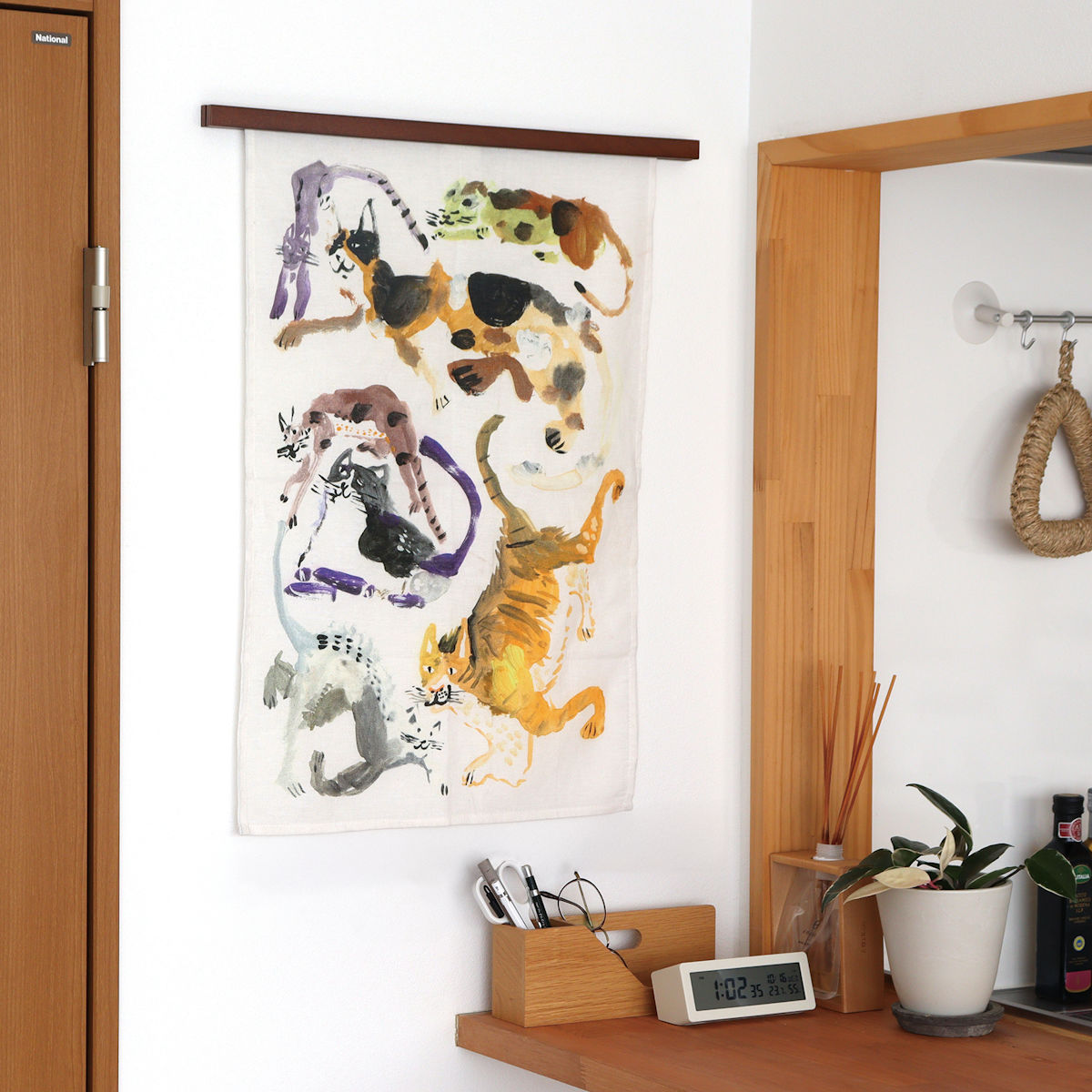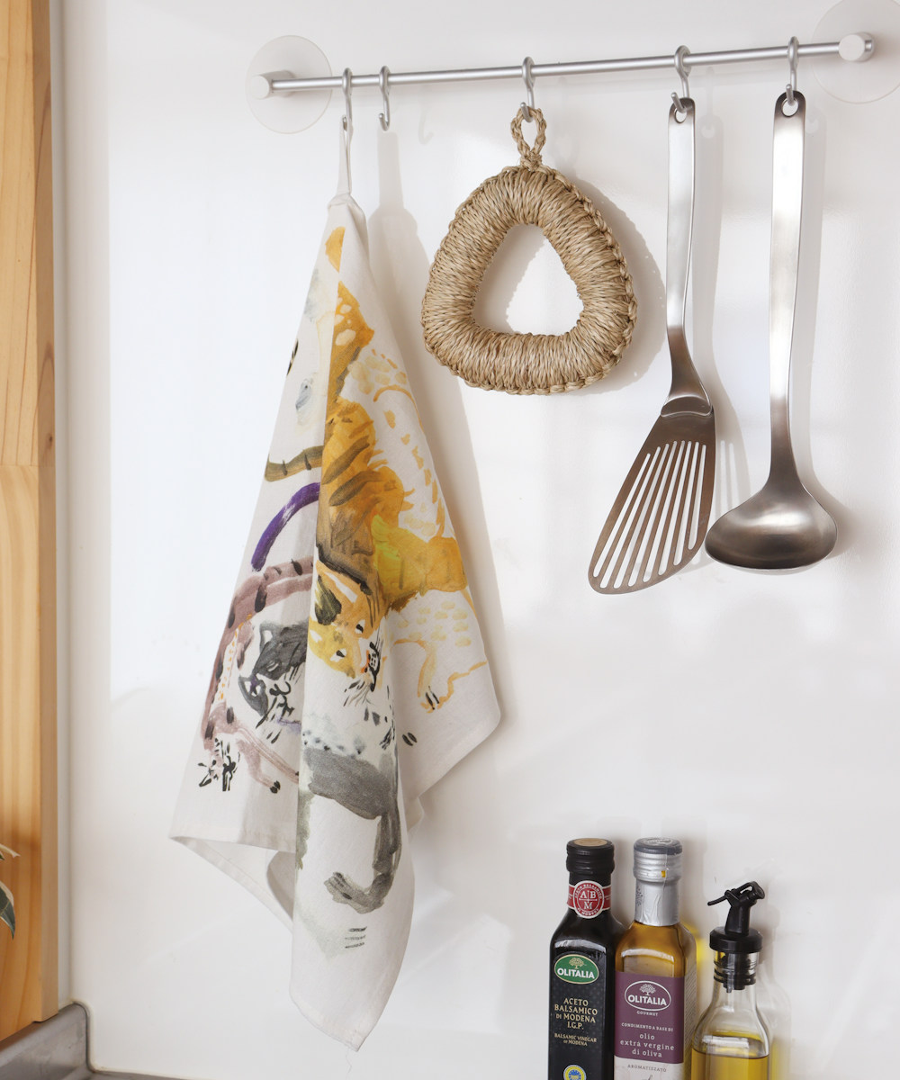 「アトリエ KOTETSU」の愛らしい猫たちのイラストが目を引く、キッチンを明るく彩るキッチンクロスです。タペストリーとして飾っても、空間に華やかさを添えてくれます。毎日の家事をちょっと楽しくしてくれる、実用性とデザイン性を兼ね備えた一枚です。