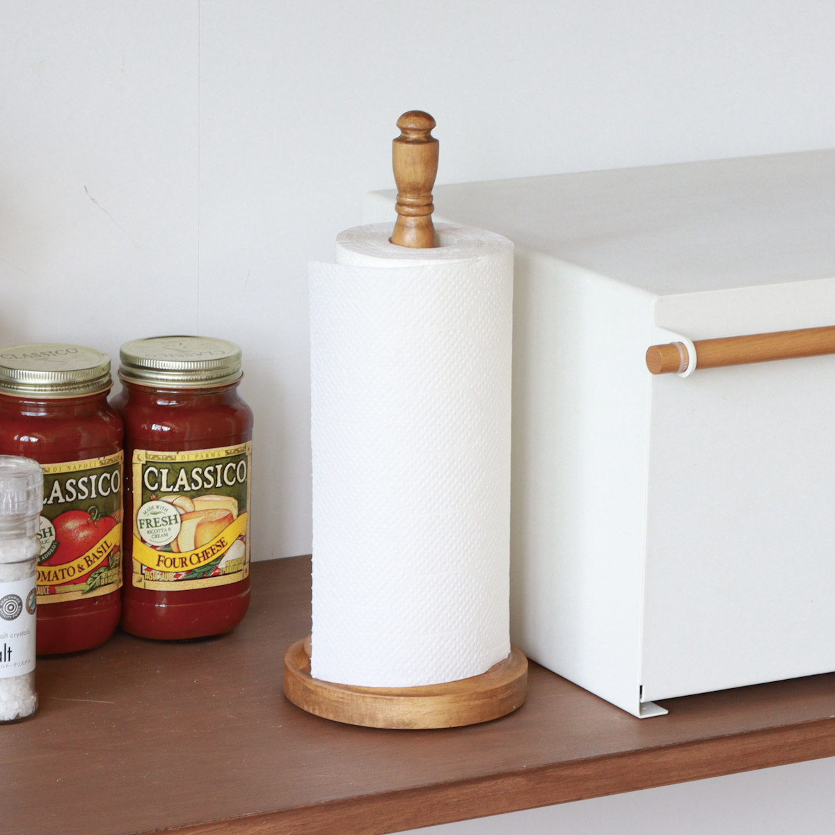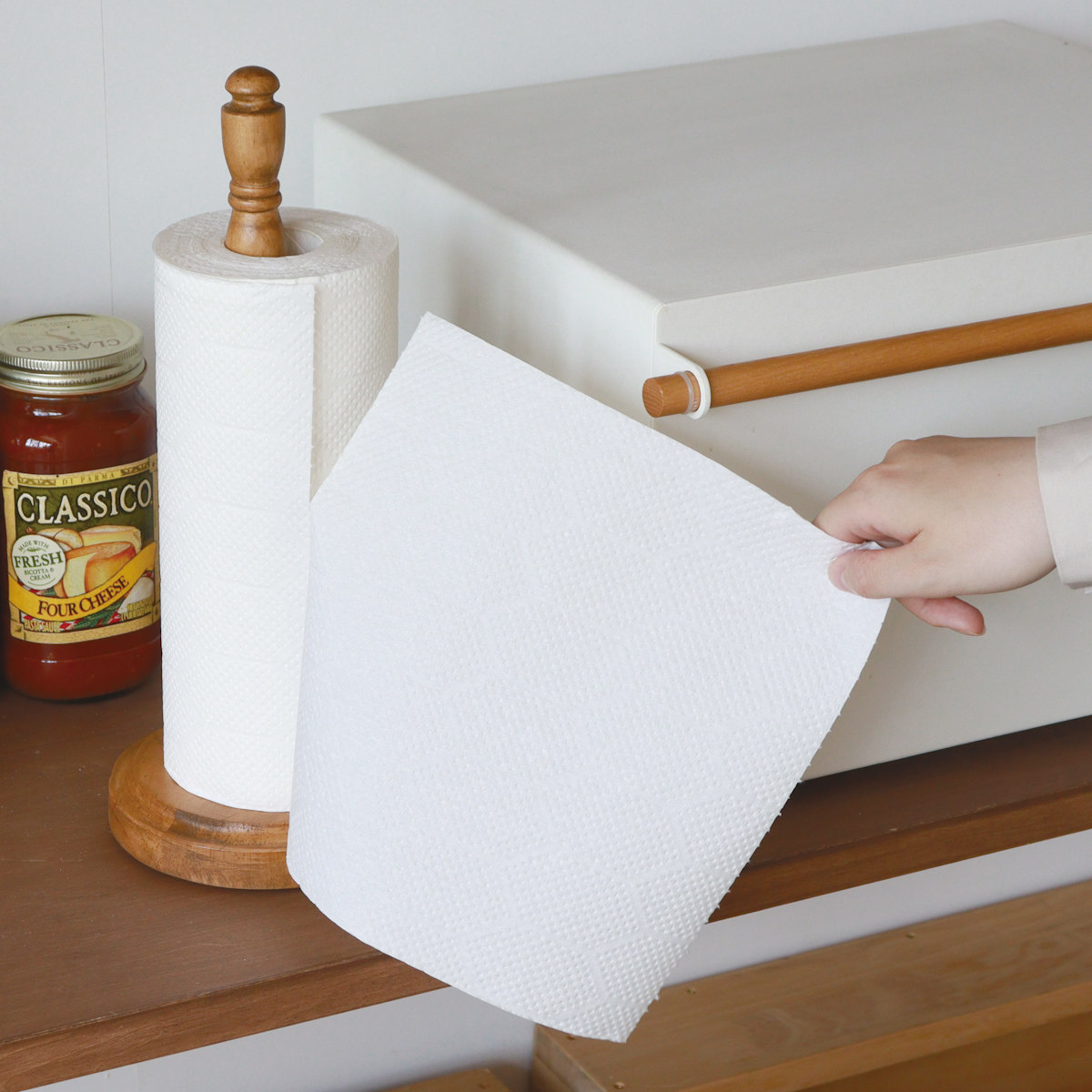 やさしい風合いが魅力のパイン材を贅沢に使用した、キッチンペーパースタンドです。シンプルながらも温かみのあるデザインで、ナチュラルインテリアや北欧スタイルのキッチンによく馴染みます。