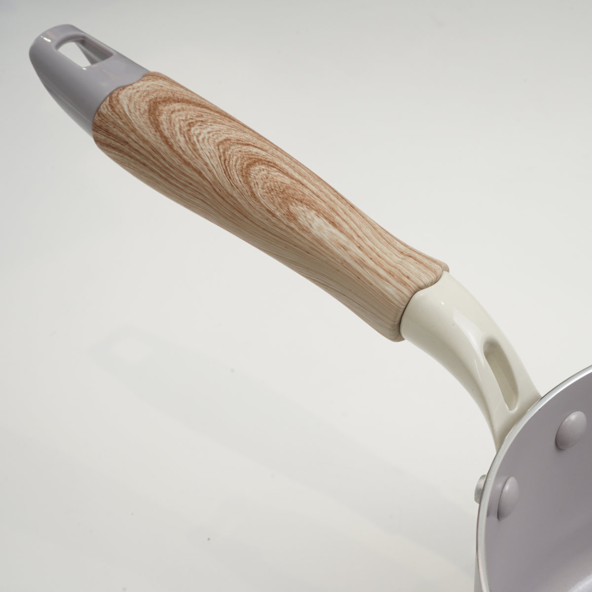 やさしい風合いの木目調ハンドルは、手になじんで持ちやすいです。蓋のつまみも木目調で、キッチンに温かみのある雰囲気を添えます。