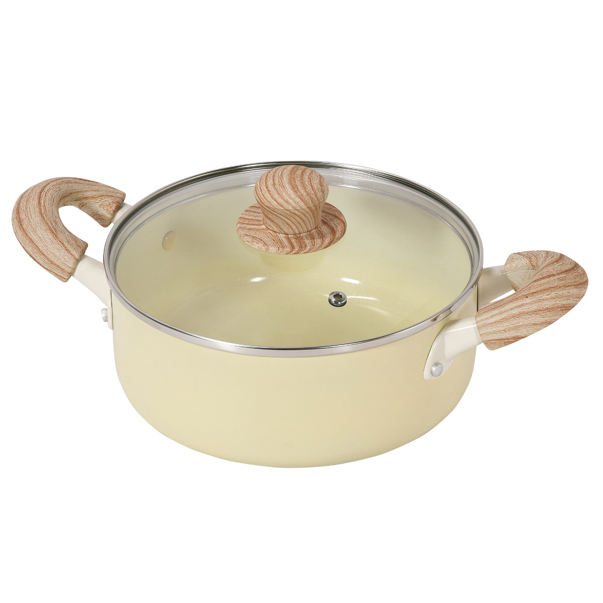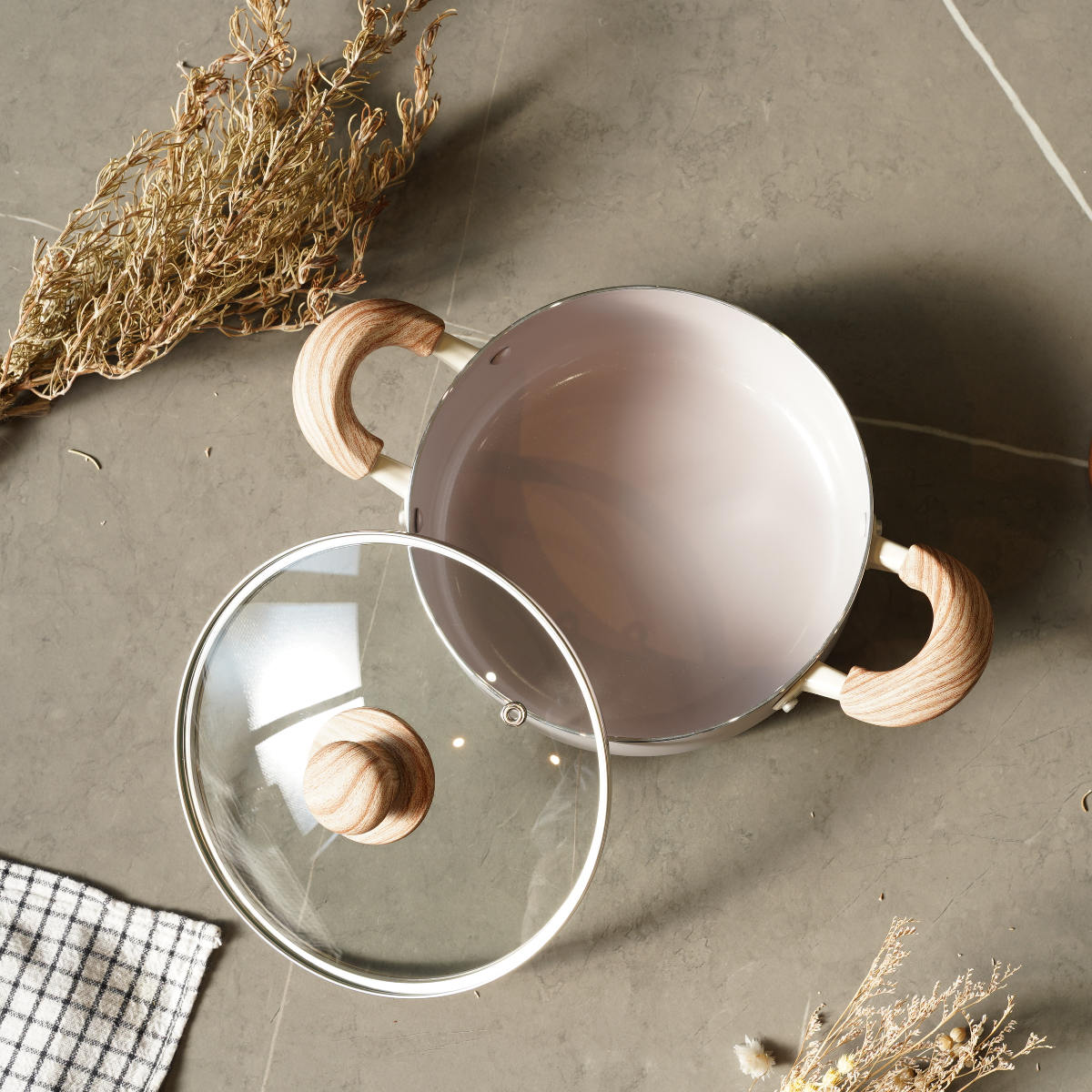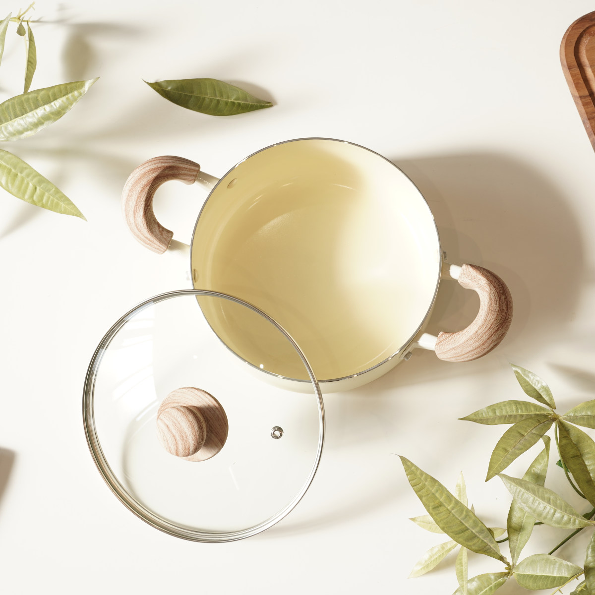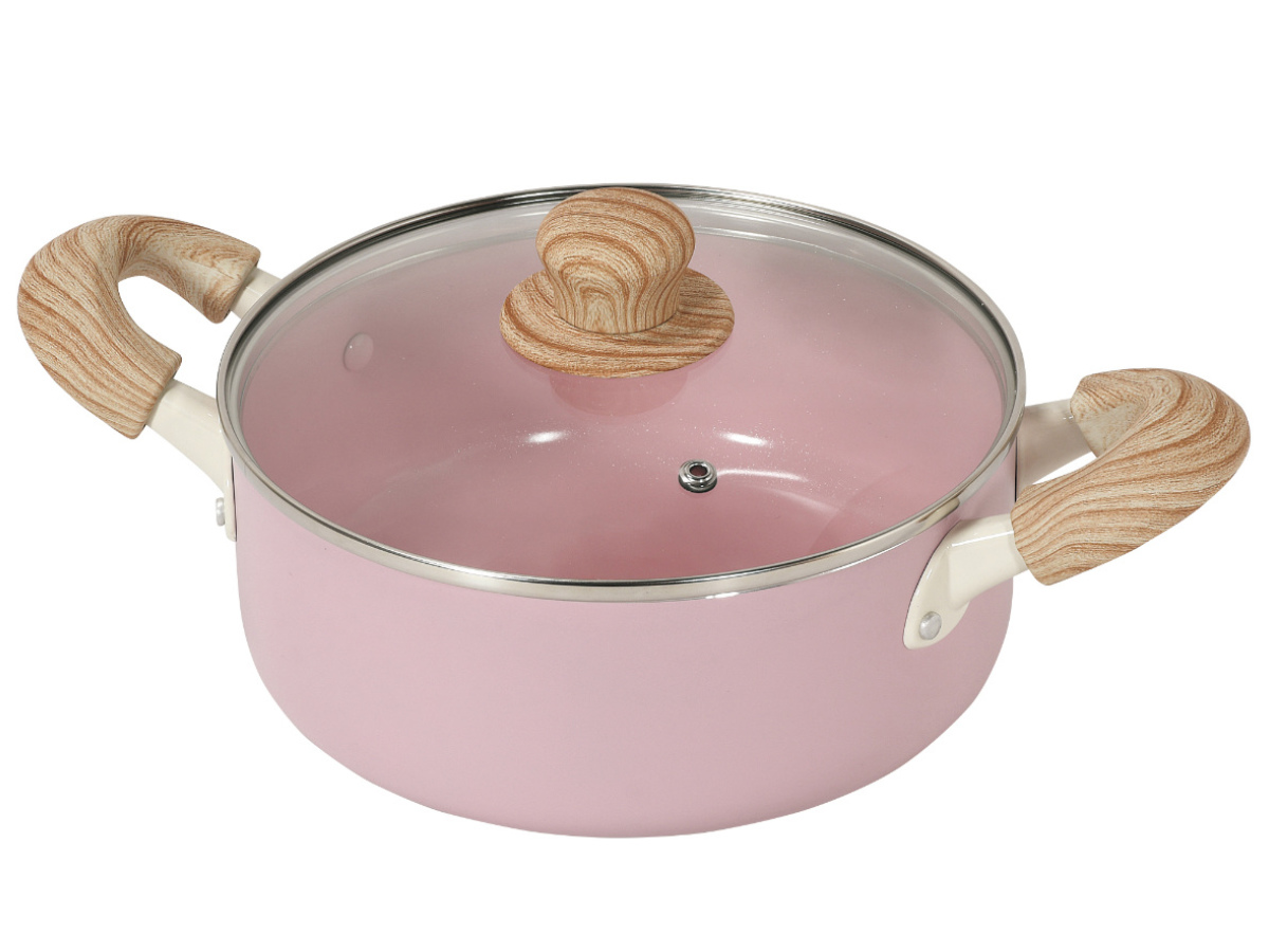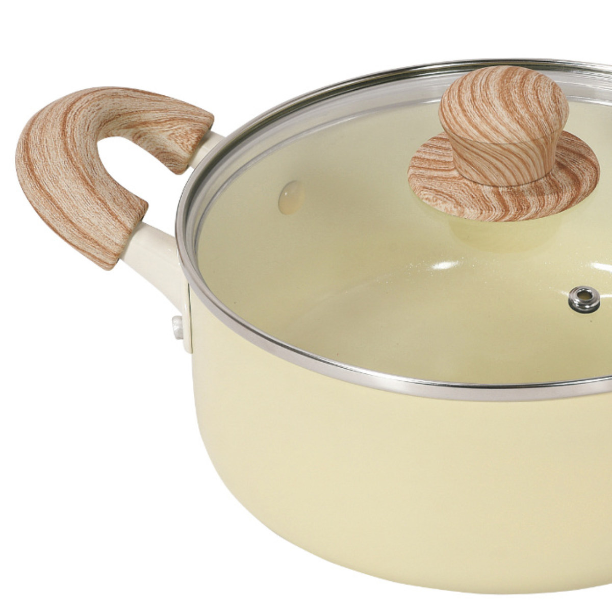 やさしい風合いの木目調ハンドルは、手になじんで持ちやすいです。蓋のつまみも木目調で、キッチンに温かみのある雰囲気を添えます。