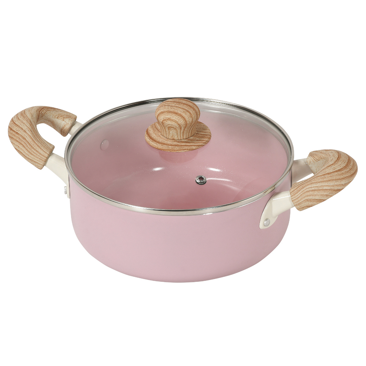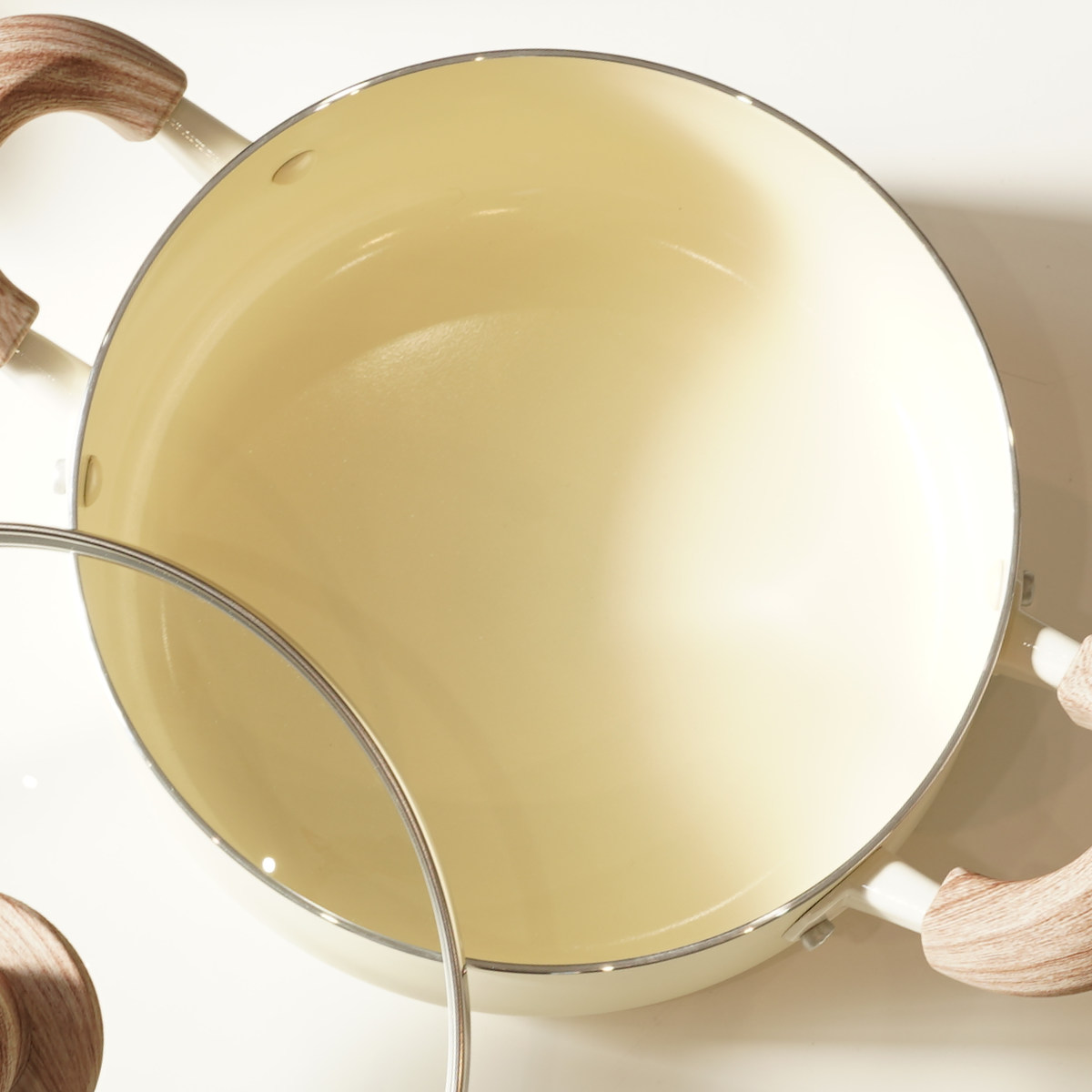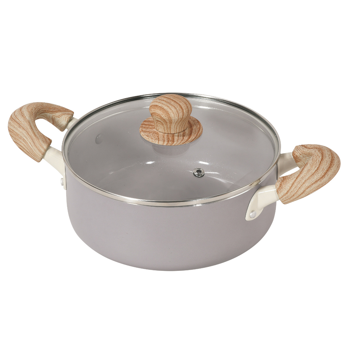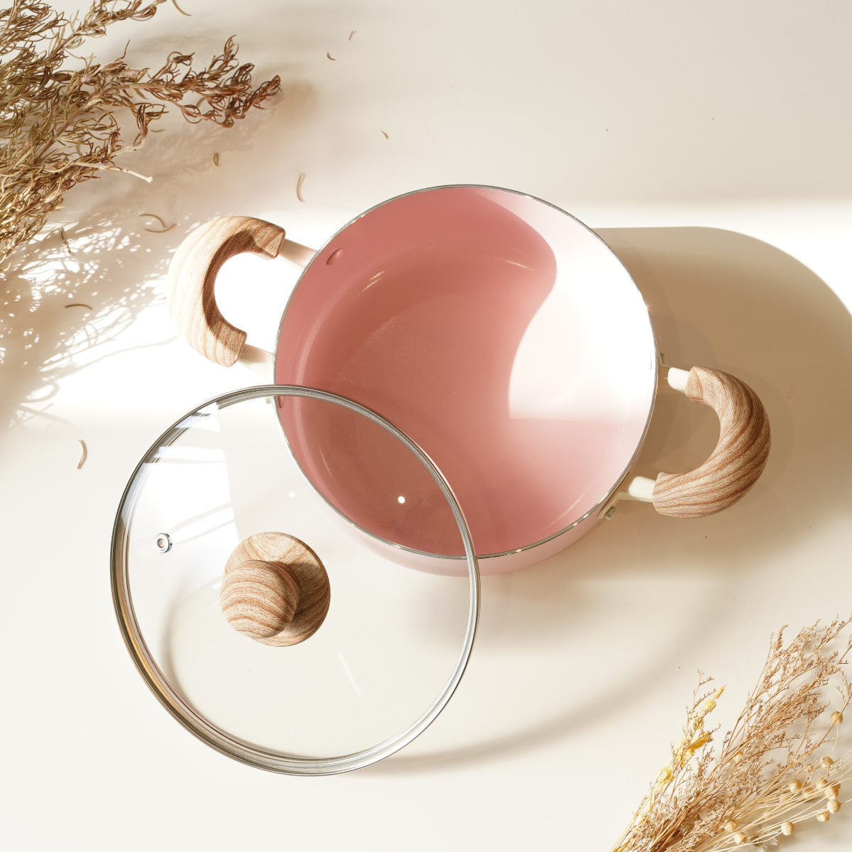 やさしい風合いの木目調ハンドルは、手になじんで持ちやすいです。蓋のつまみも木目調で、キッチンに温かみのある雰囲気を添えます。