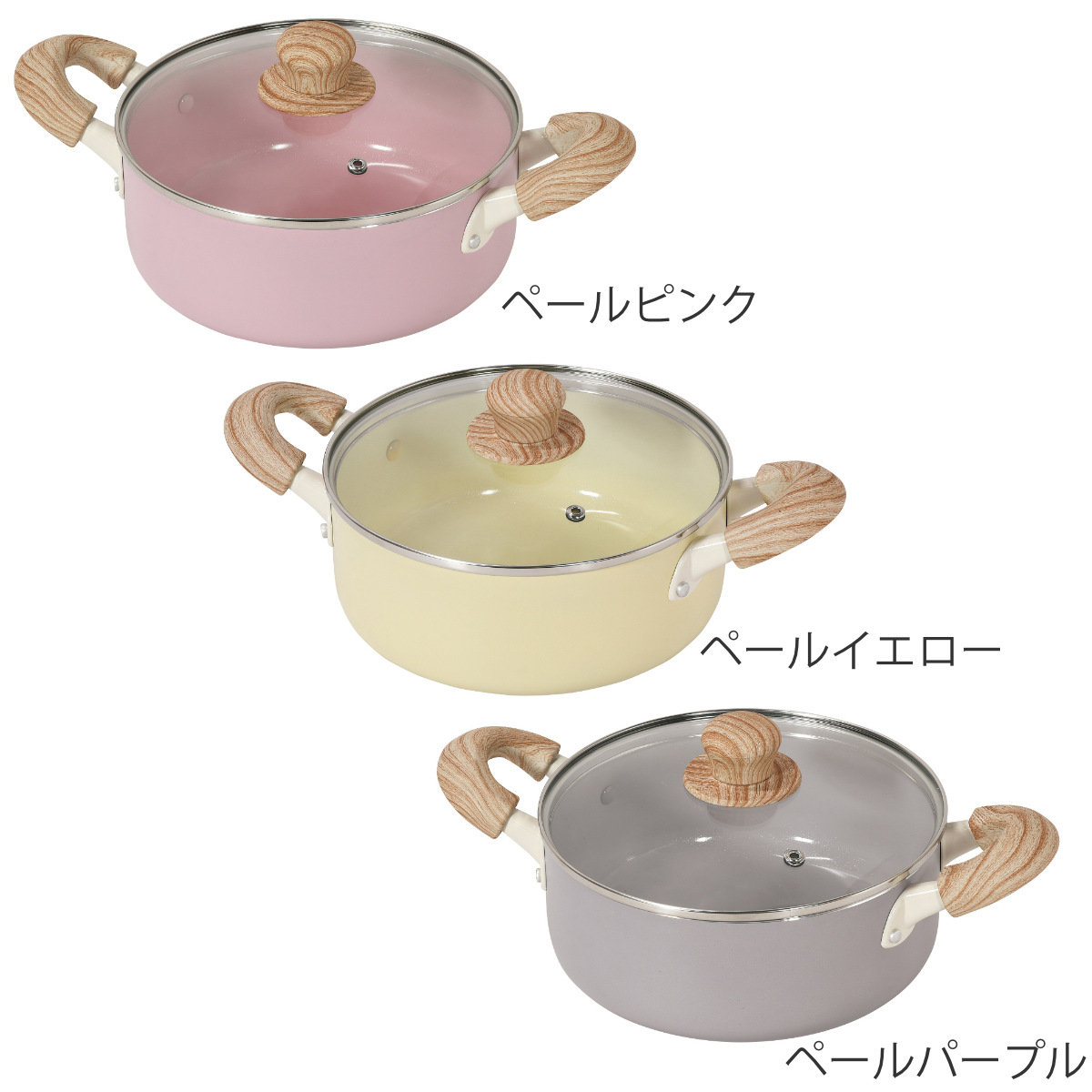 やわらかなパステルカラーに上品さをプラスしたパステルモダンカラーの両手鍋です。軽やかで洗練された色合いがキッチンを明るく彩ります。