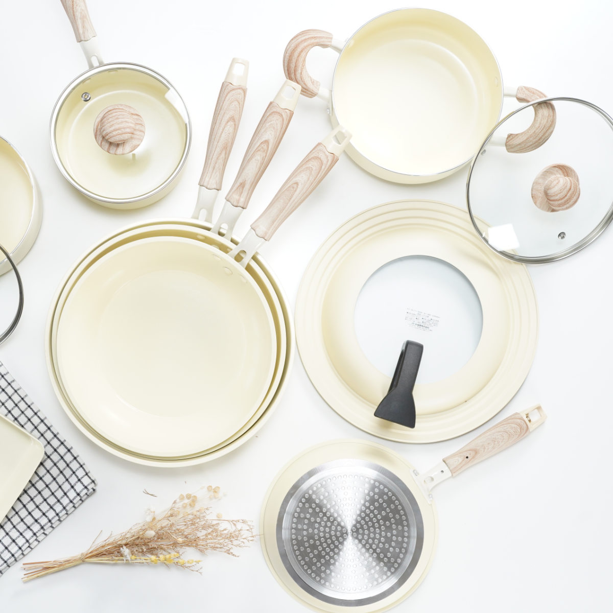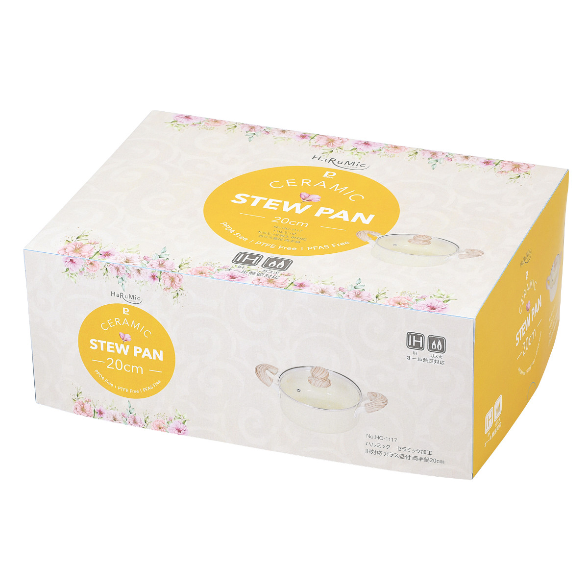 | 材質 | 本体:アルミニウム合金 はり底:ステンレス鋼(クロム16%) 取っ手:フェノール樹脂 ガラス蓋:強化ガラス製器具 強化の種類:全面物理強化 その他の材料、縁リング:ステンレス鋼 つまみ・座板:フェノール樹脂 表面加工、本体内面:セラミック塗膜加工 本体外面:焼付け塗装 |