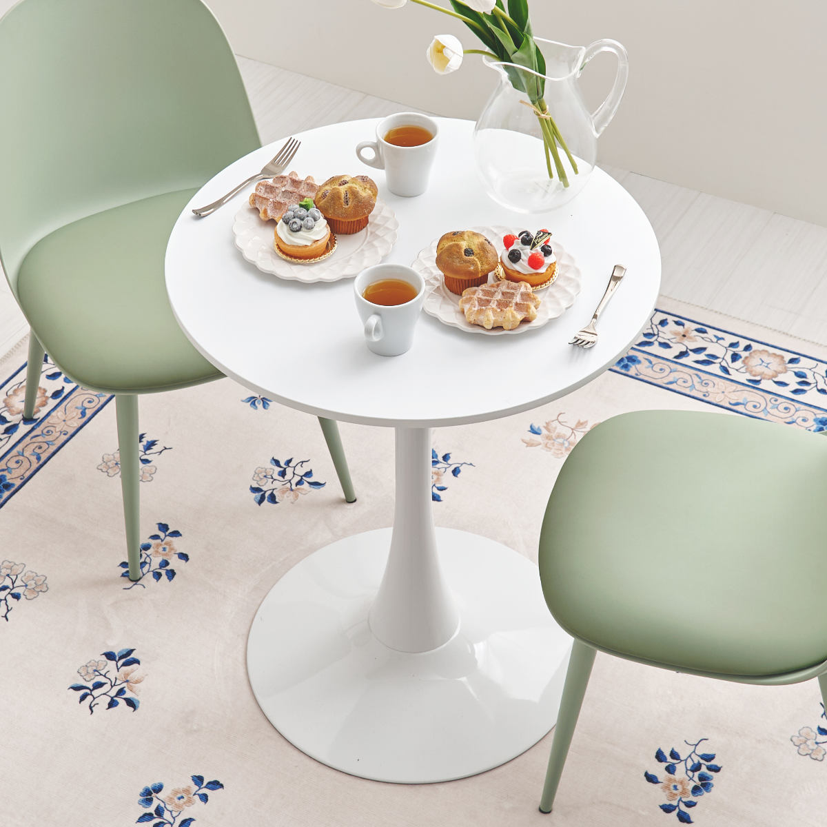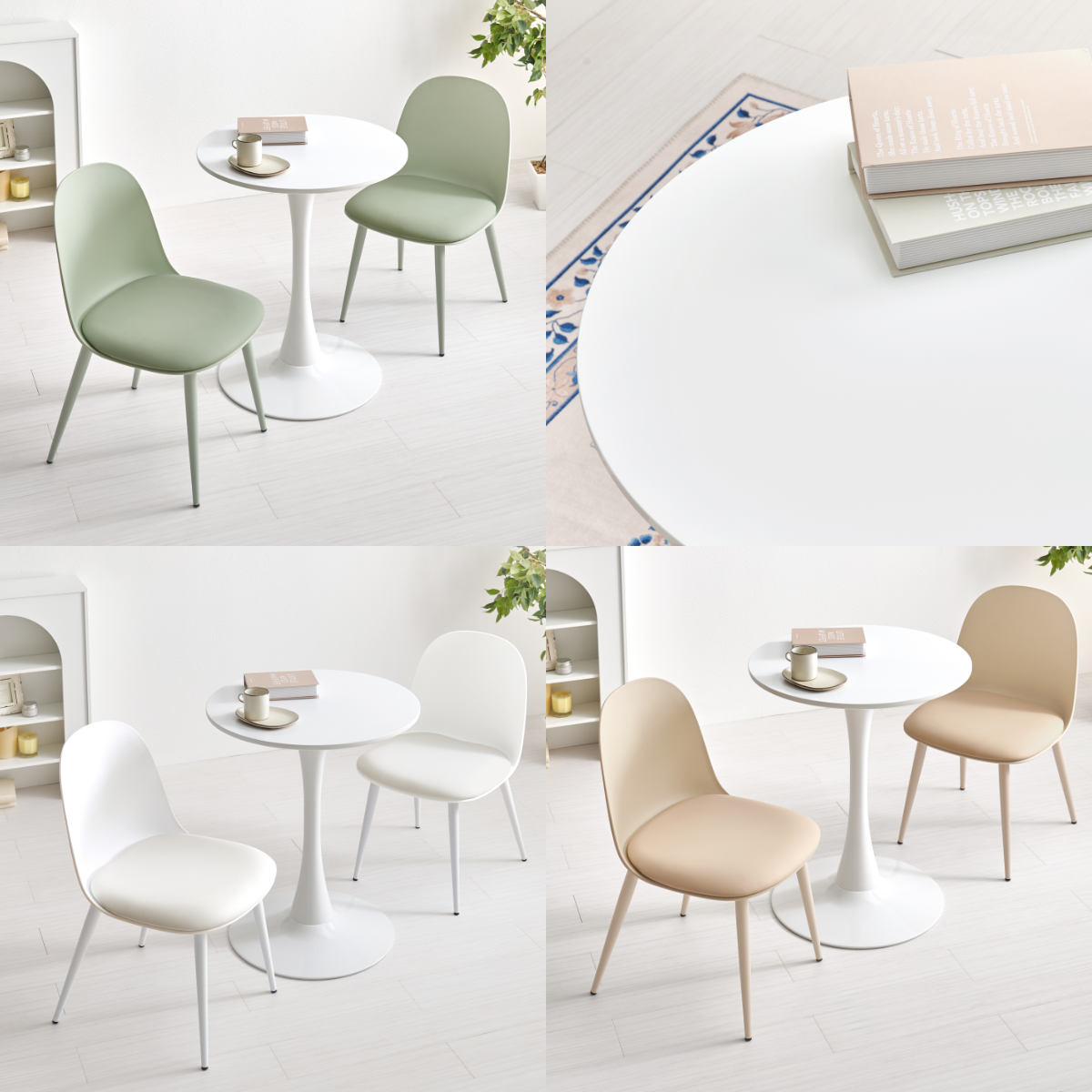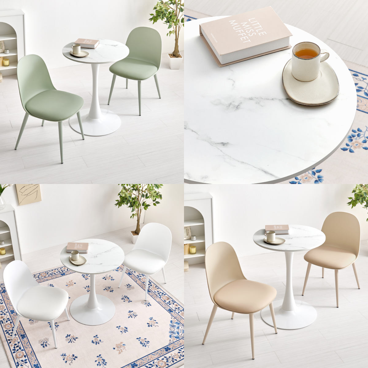 やさしい丸型のカフェテーブルとチェア同色2脚のセットです。テーブル天板は上品なマーブル柄と清潔感のあるホワイトの2種類、チェアはくすみカラーの3色から選択可能。丸い天板と柔らかなフォルムのチェアが空間をやさしく彩り、2人での食事やティータイムを心地よい時間にしてくれます。