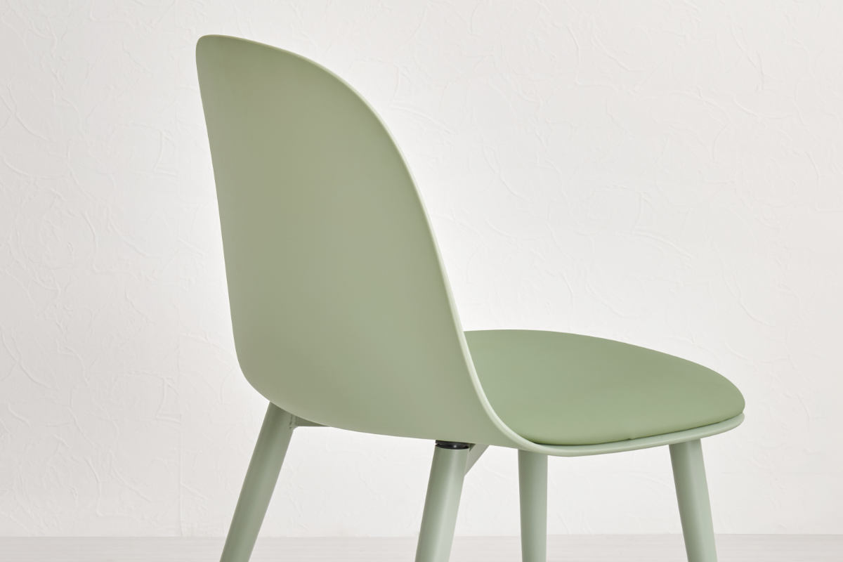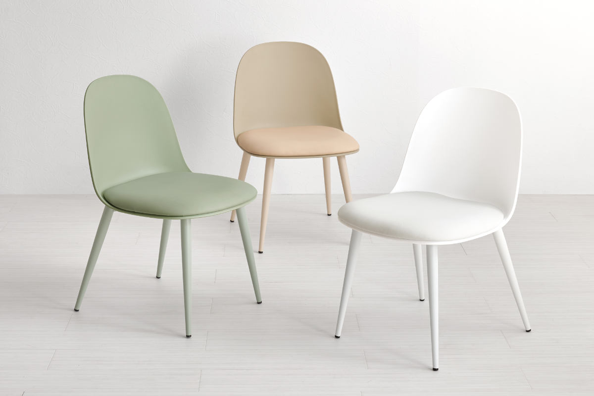 くすみカラーに丸いフォルムが調和したデザイン。座面に合う色で脚をコーティング。マットな質感で柔らかい雰囲気です。