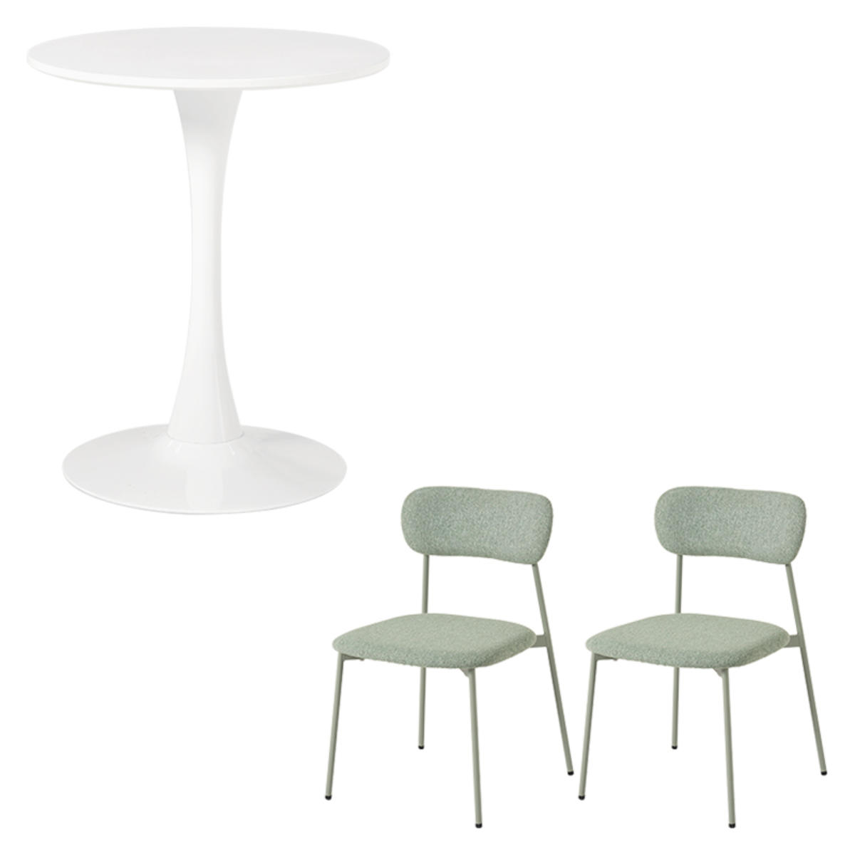 やさしい丸型のカフェテーブルとチェア同色2脚のセットです。テーブル天板は上品なマーブル柄と清潔感のあるホワイトの2種類、チェアはくすみカラーの3色から選択可能。丸い天板と柔らかなフォルムのチェアが空間をやさしく彩り、2人での食事やティータイムを心地よい時間にしてくれます。