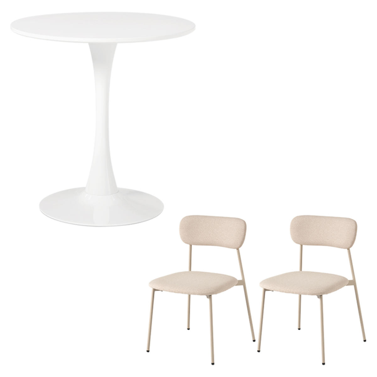 やさしい丸型のカフェテーブルとチェア同色2脚のセットです。テーブル天板は上品なマーブル柄と清潔感のあるホワイトの2種類、チェアはくすみカラーの3色から選択可能。丸い天板と柔らかなフォルムのチェアが空間をやさしく彩り、2人での食事やティータイムを心地よい時間にしてくれます。