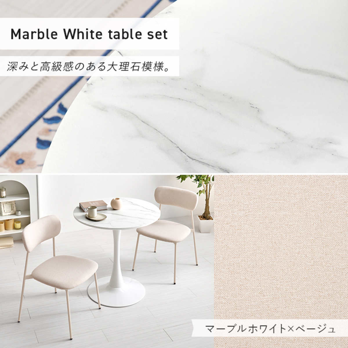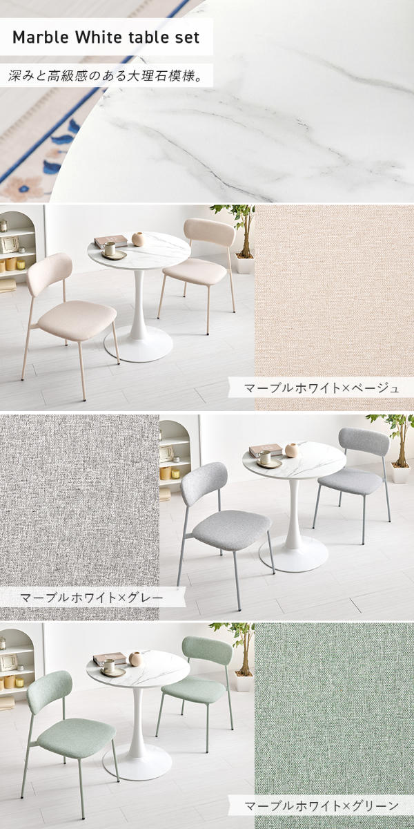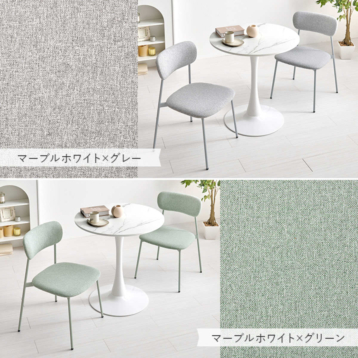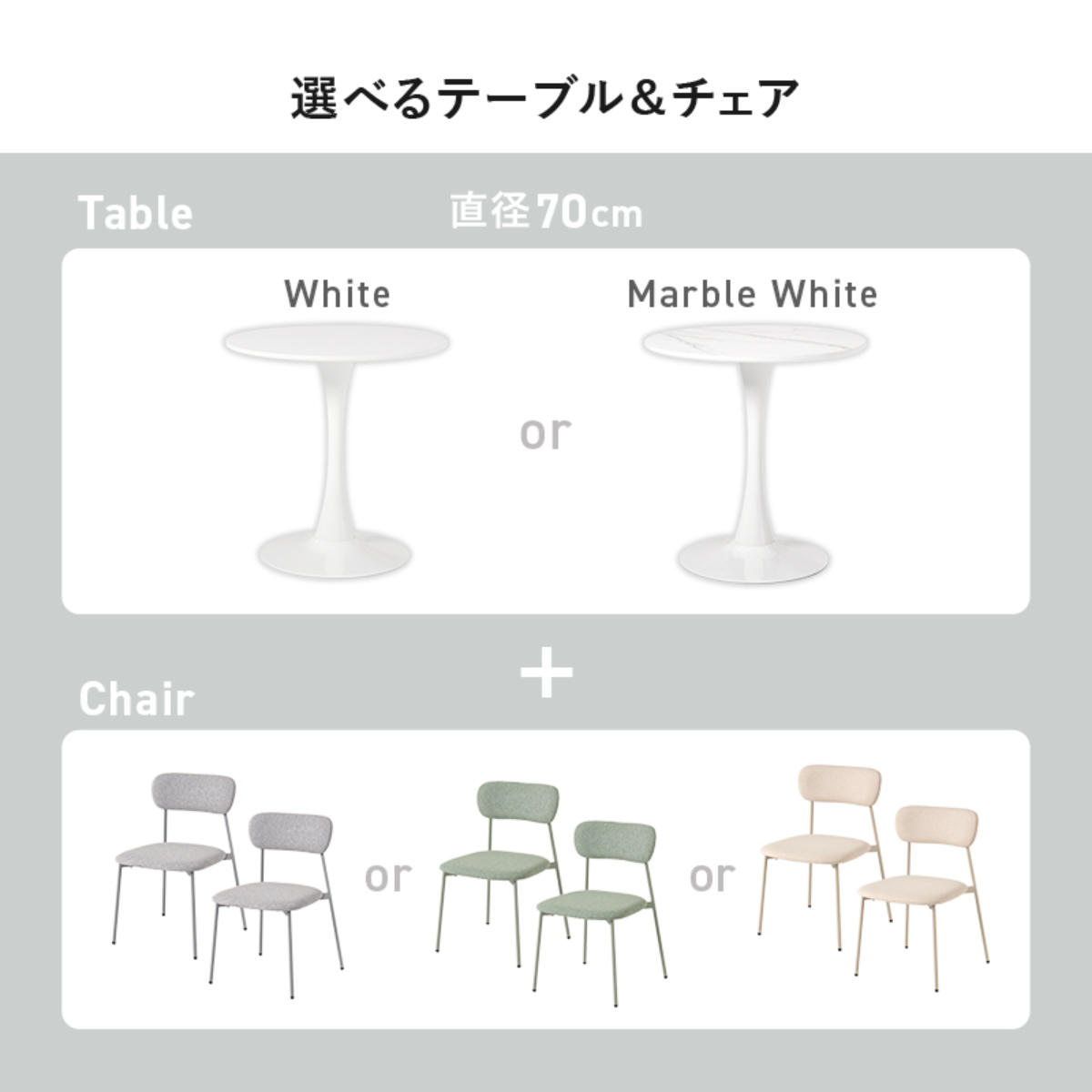 やさしい丸型のカフェテーブルとチェア同色2脚のセットです。テーブル天板は上品なマーブル柄と清潔感のあるホワイトの2種類、チェアはくすみカラーの3色から選択可能。丸い天板と柔らかなフォルムのチェアが空間をやさしく彩り、2人での食事やティータイムを心地よい時間にしてくれます。