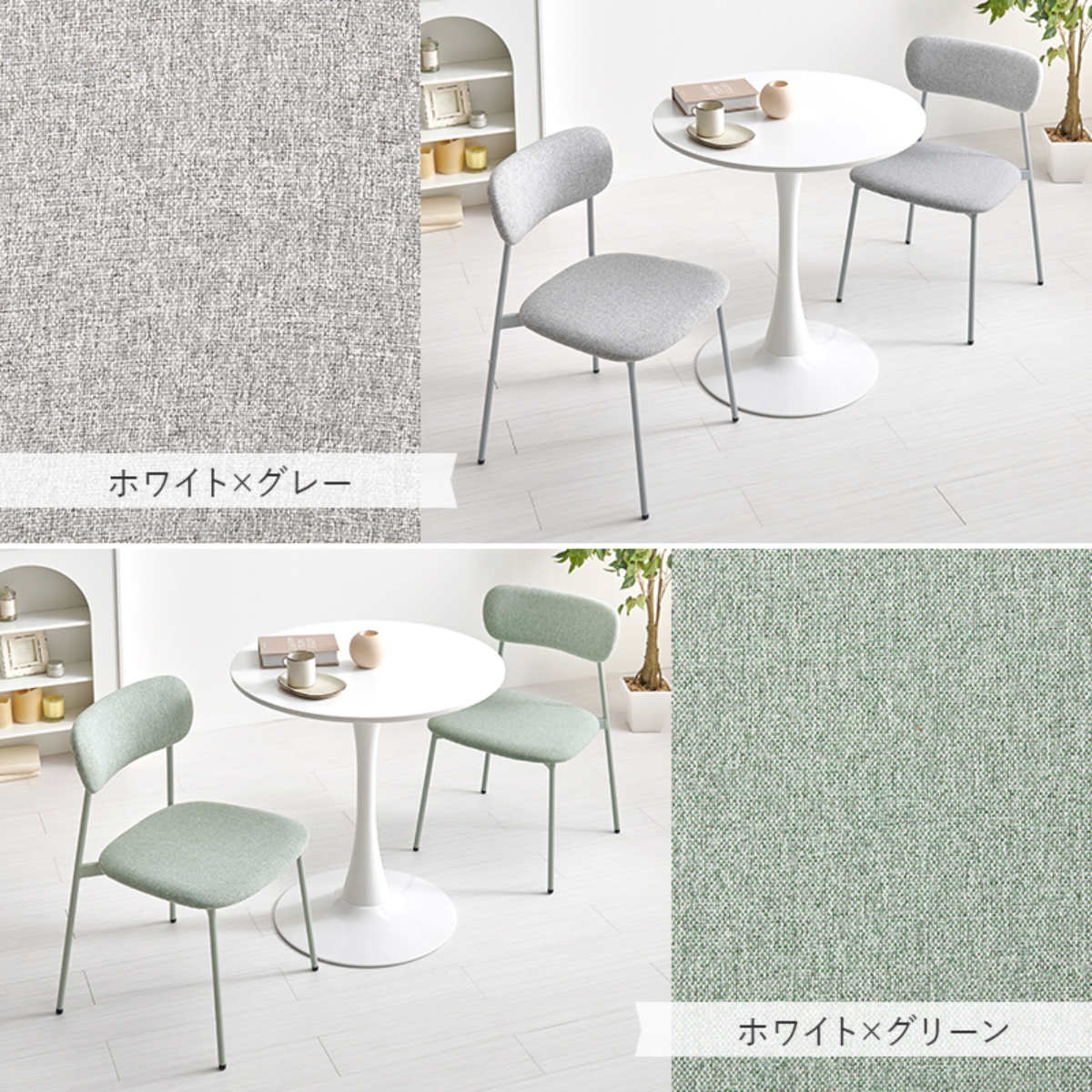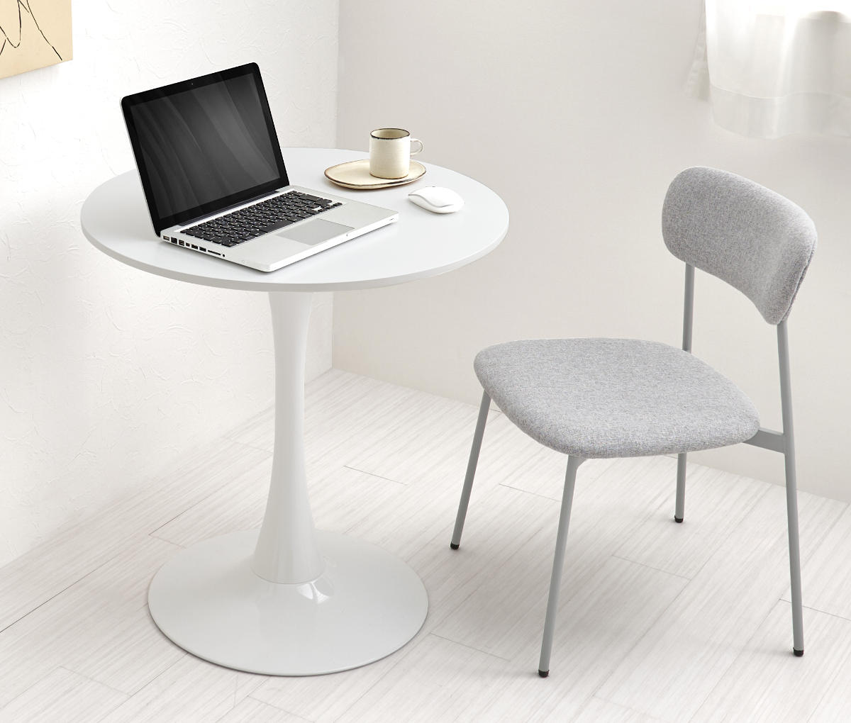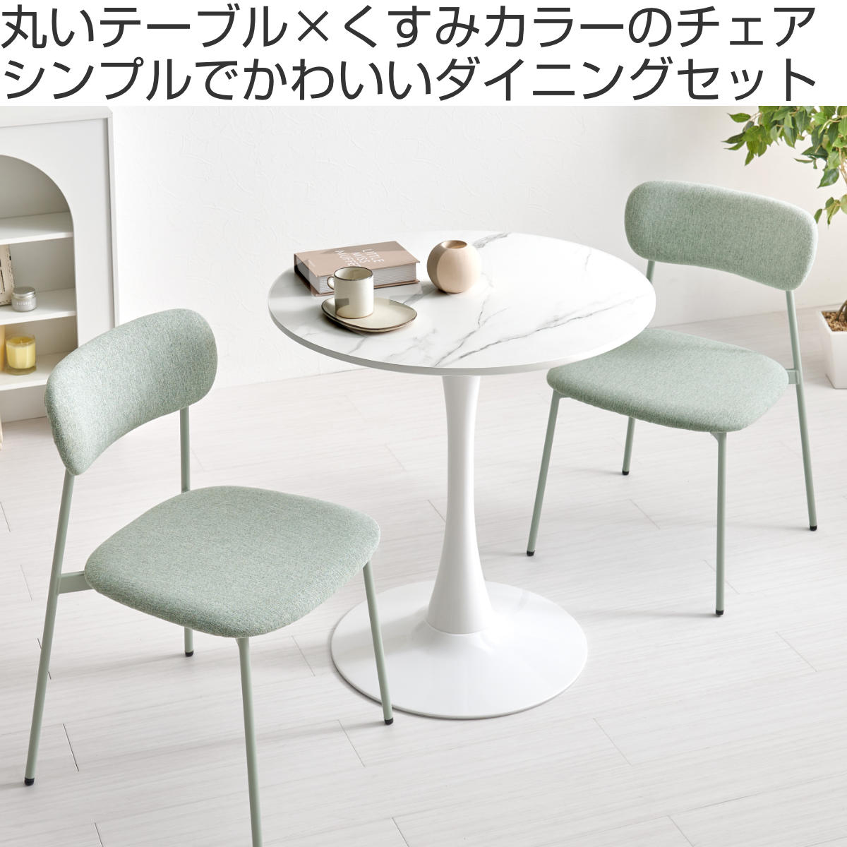 やさしい丸型のカフェテーブルとチェア同色2脚のセットです。テーブル天板は上品なマーブル柄と清潔感のあるホワイトの2種類、チェアはくすみカラーの3色から選択可能。丸い天板と柔らかなフォルムのチェアが空間をやさしく彩り、2人での食事やティータイムを心地よい時間にしてくれます。