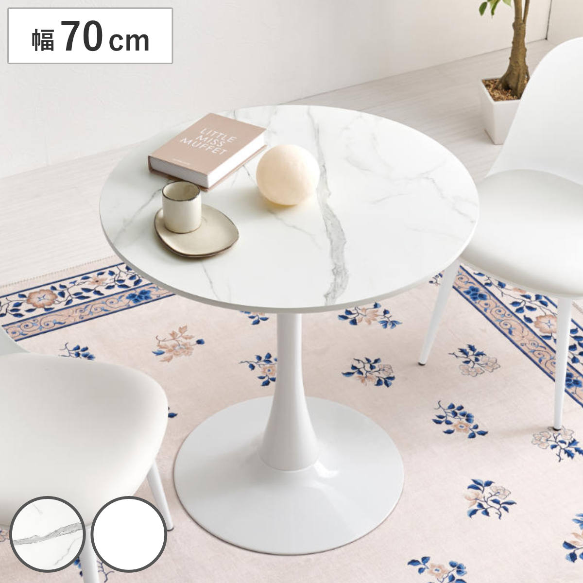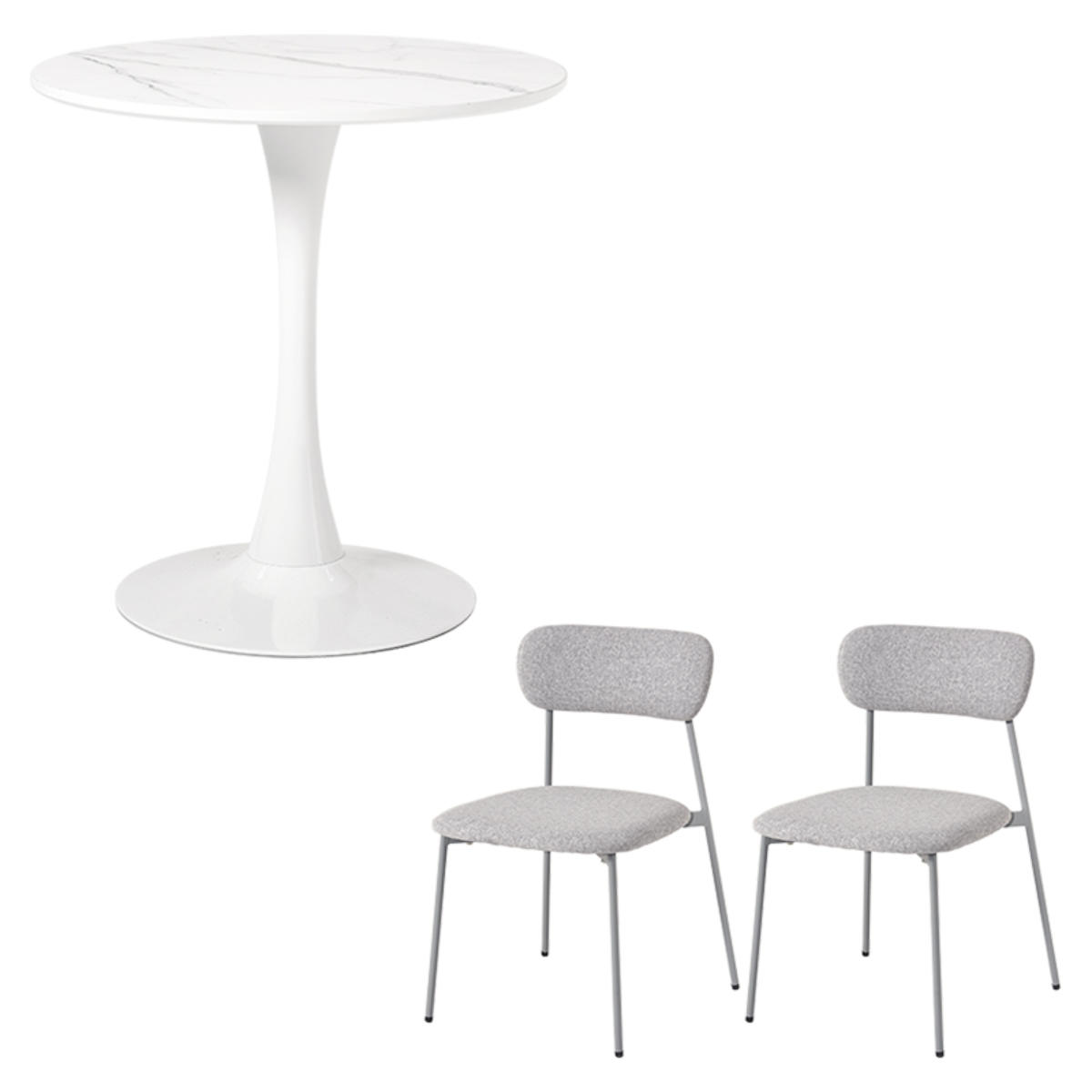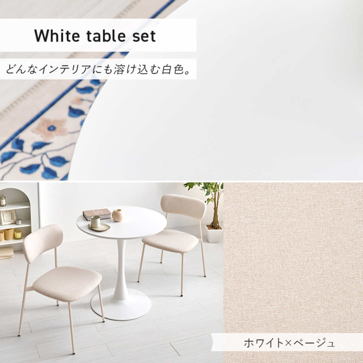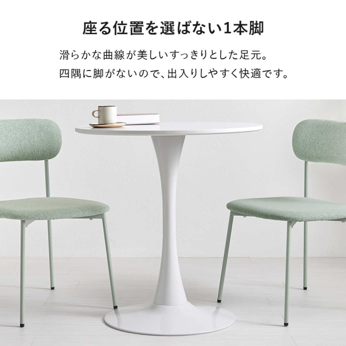 やさしい丸型のカフェテーブルとチェア同色2脚のセットです。テーブル天板は上品なマーブル柄と清潔感のあるホワイトの2種類、チェアはくすみカラーの3色から選択可能。丸い天板と柔らかなフォルムのチェアが空間をやさしく彩り、2人での食事やティータイムを心地よい時間にしてくれます。