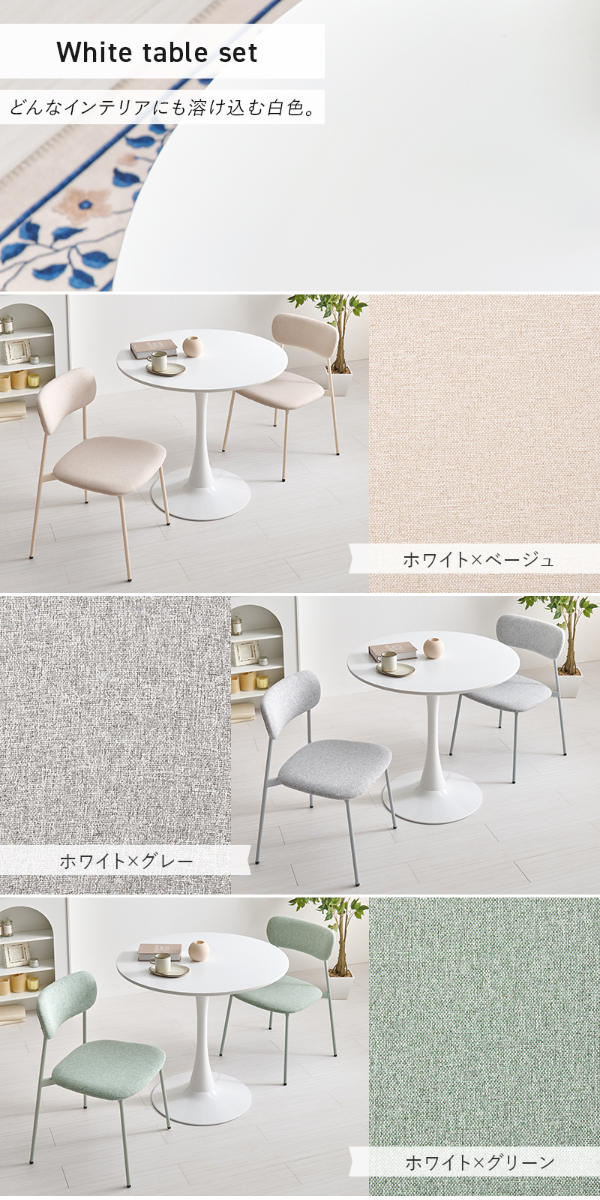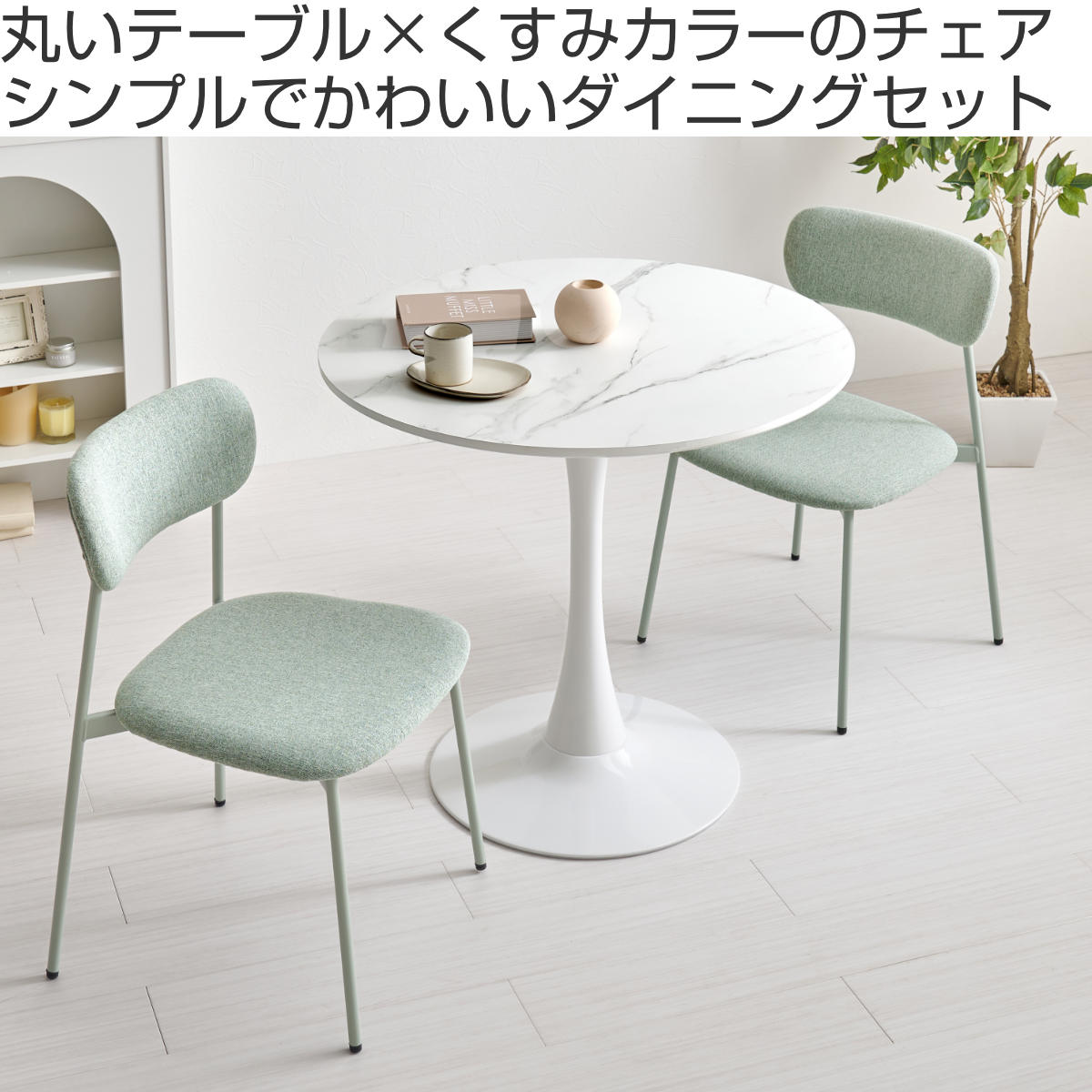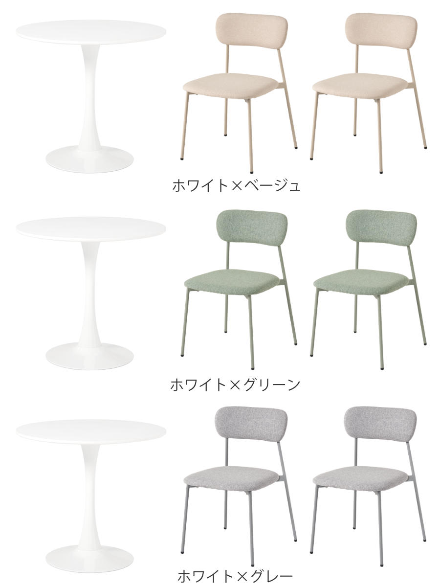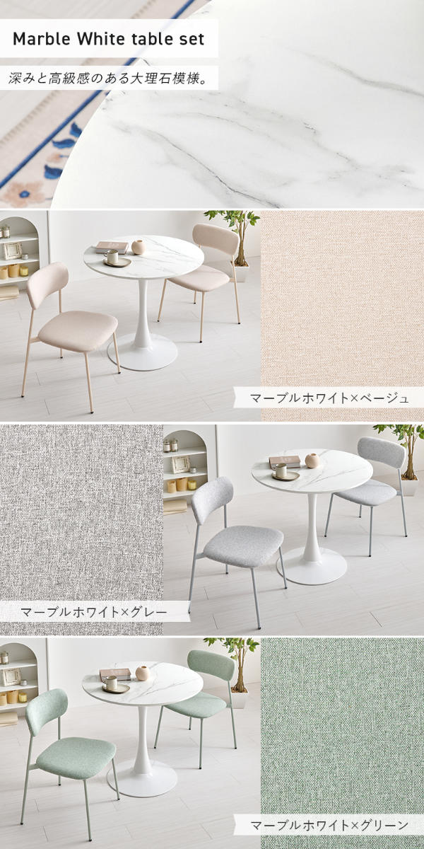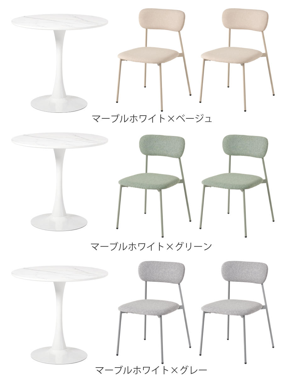 やさしい丸型のカフェテーブルとチェア同色2脚のセットです。テーブル天板は上品なマーブル柄と清潔感のあるホワイトの2種類、チェアはくすみカラーの3色から選択可能。丸い天板と柔らかなフォルムのチェアが空間をやさしく彩り、2人での食事やティータイムを心地よい時間にしてくれます。