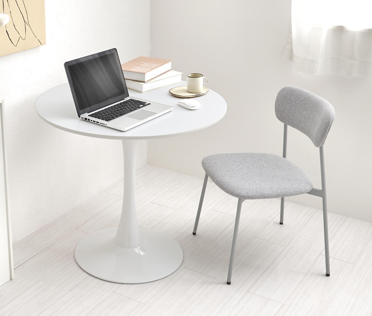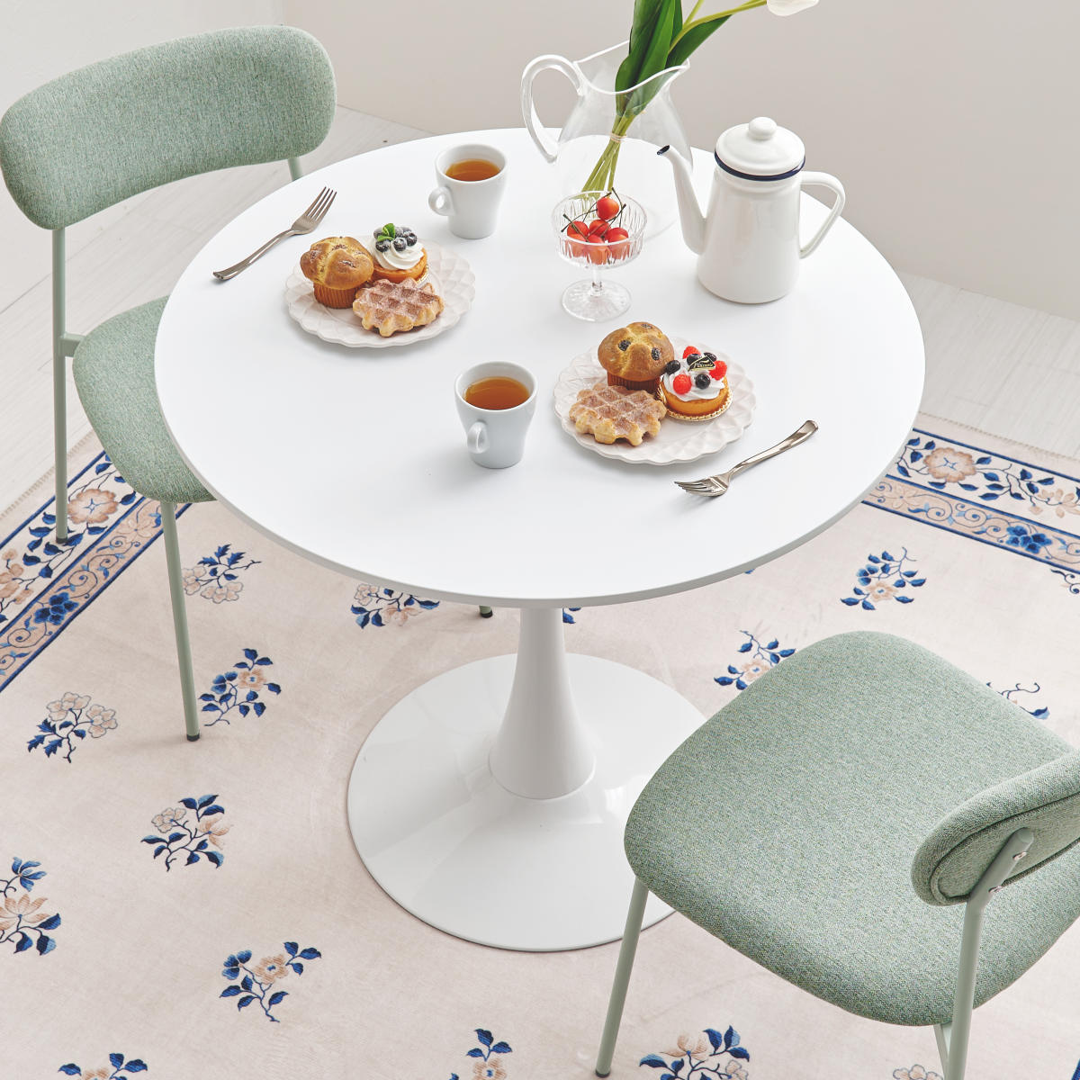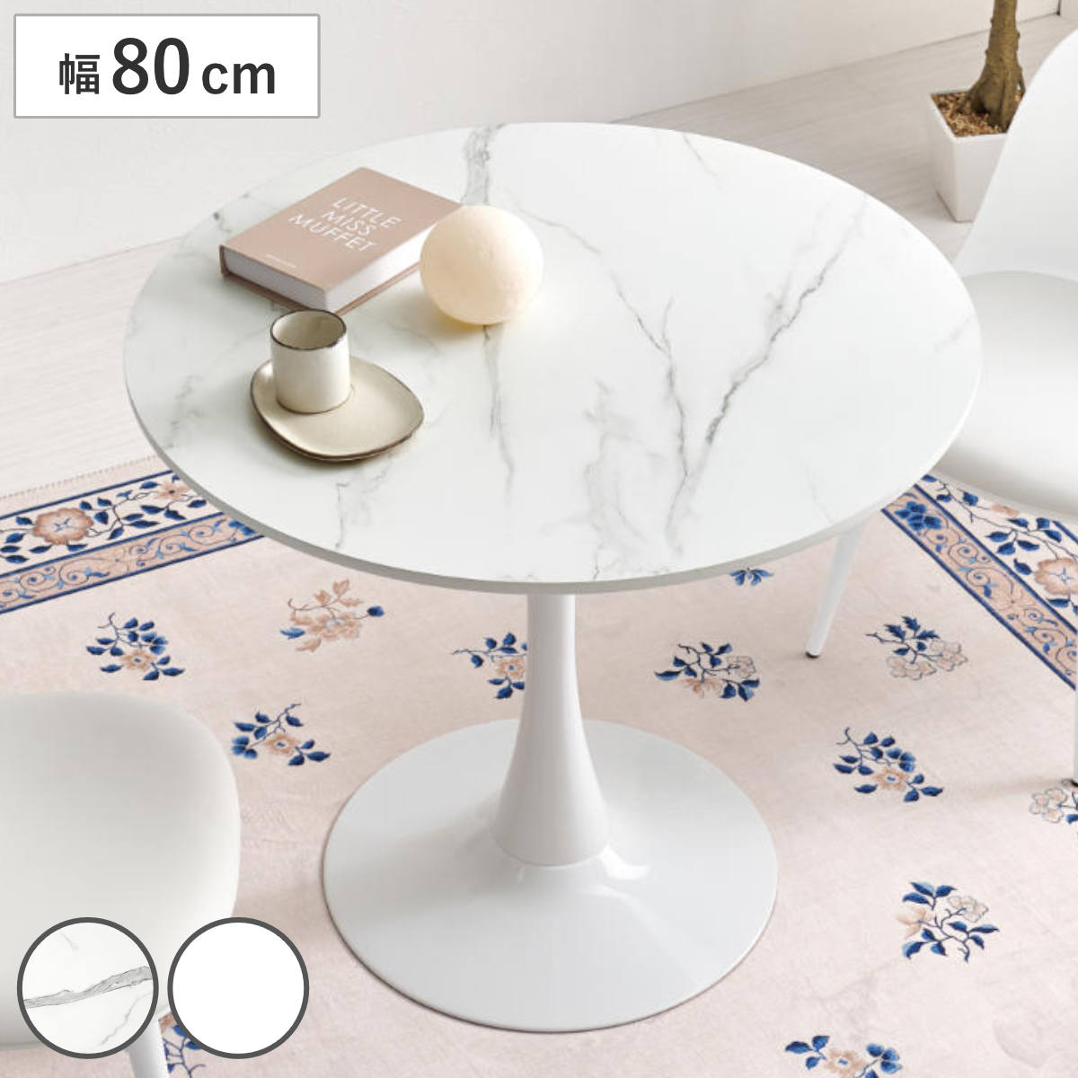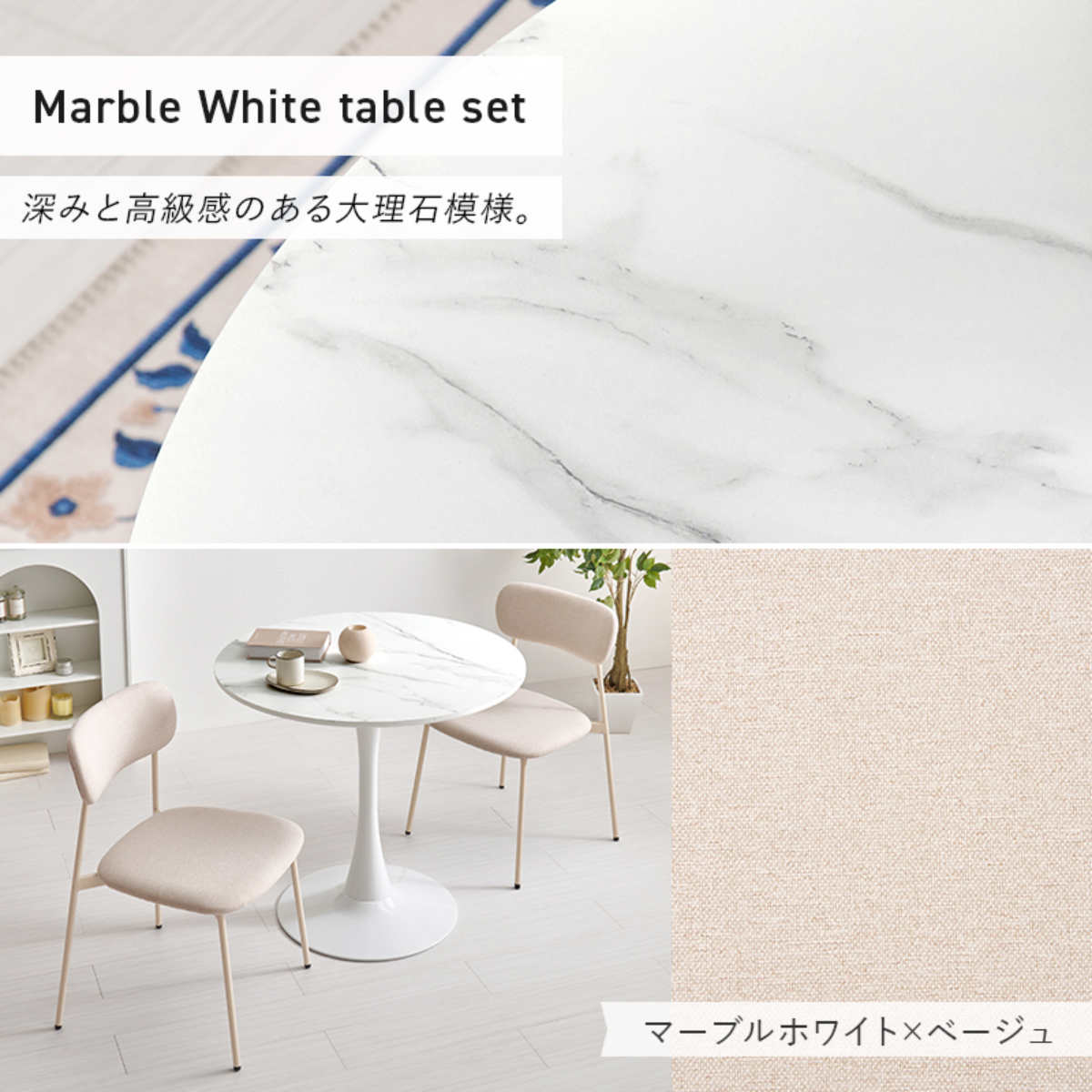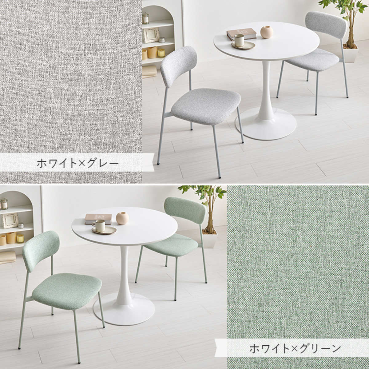やさしい丸型のカフェテーブルとチェア同色2脚のセットです。テーブル天板は上品なマーブル柄と清潔感のあるホワイトの2種類、チェアはくすみカラーの3色から選択可能。丸い天板と柔らかなフォルムのチェアが空間をやさしく彩り、2人での食事やティータイムを心地よい時間にしてくれます。