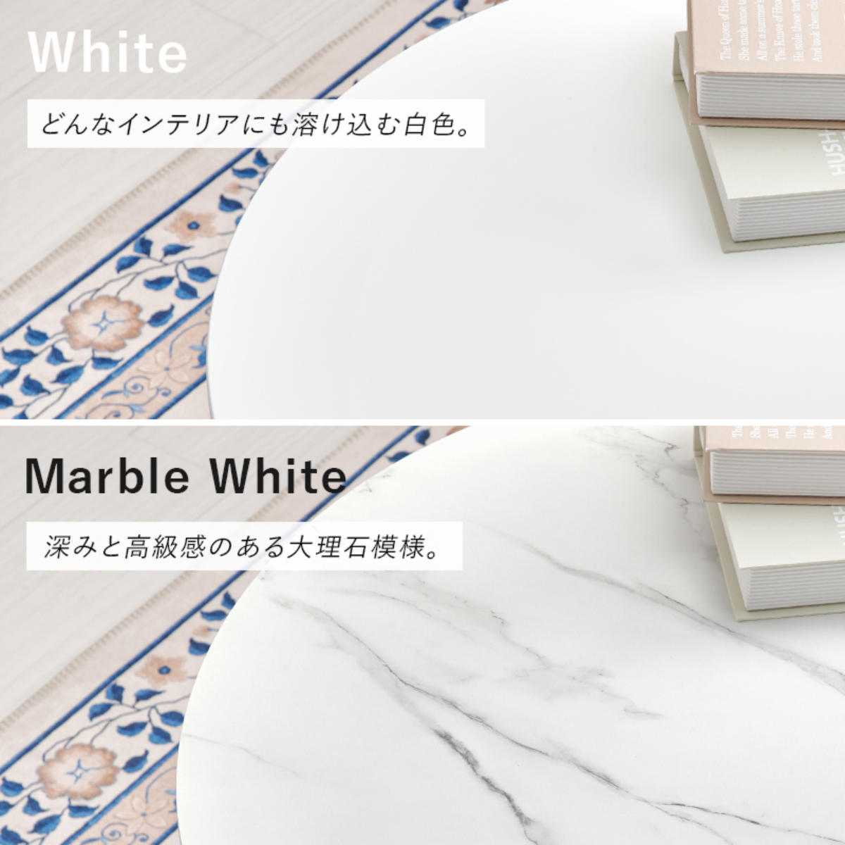 天板はキズや汚れに強いメラニン素材でお手入れが簡単です。清潔感のあるホワイトと高級感のある大理石調マーブル柄の2種類から、お部屋や好みに合わせて選べます。
