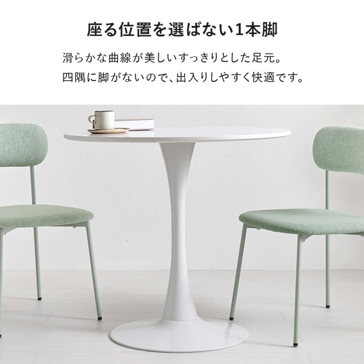 四隅に脚がないので出入りがスムーズ。足元はスッキリ見え、空間を広く使えます。座る位置を選ばず、向かい合いやすいデザインで会話も弾みます。