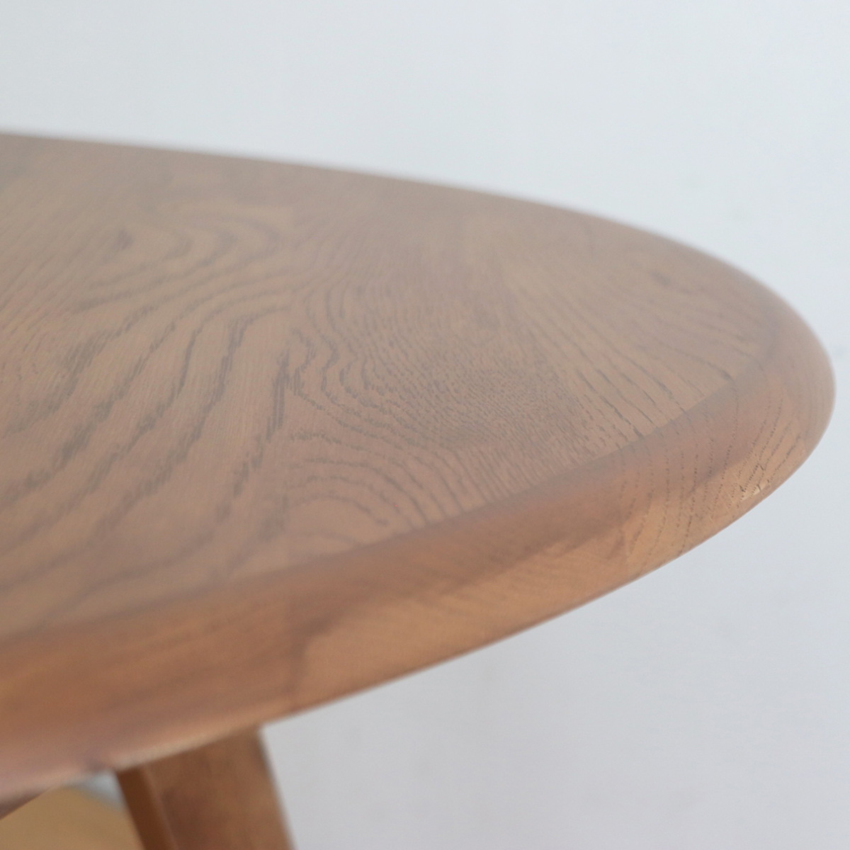 やさしい丸みをおびたフォルムの天板にはオーク無垢(ウレタン塗装)を使用しています。こっくりとしたブラウンと木目の美しさからは、無垢ならではの上質なぬくもりを感じられます。
