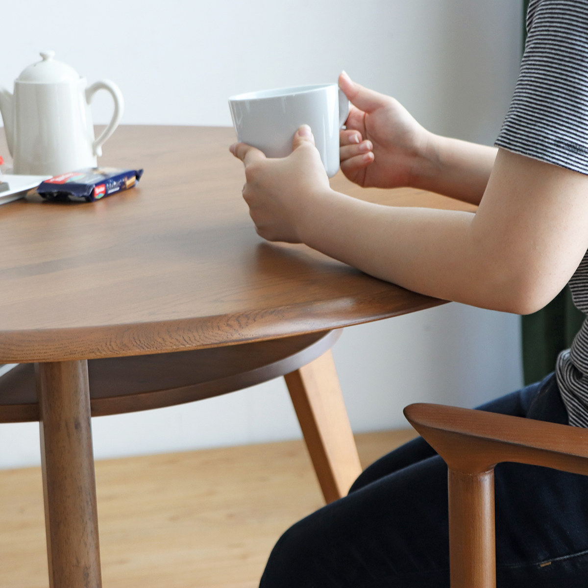 家族や友人と顔をあわせて食事を楽しめる、円形のダイニングテーブルです。円形の天板は空間にリズムをつくり、お部屋に解放感をプラスします。