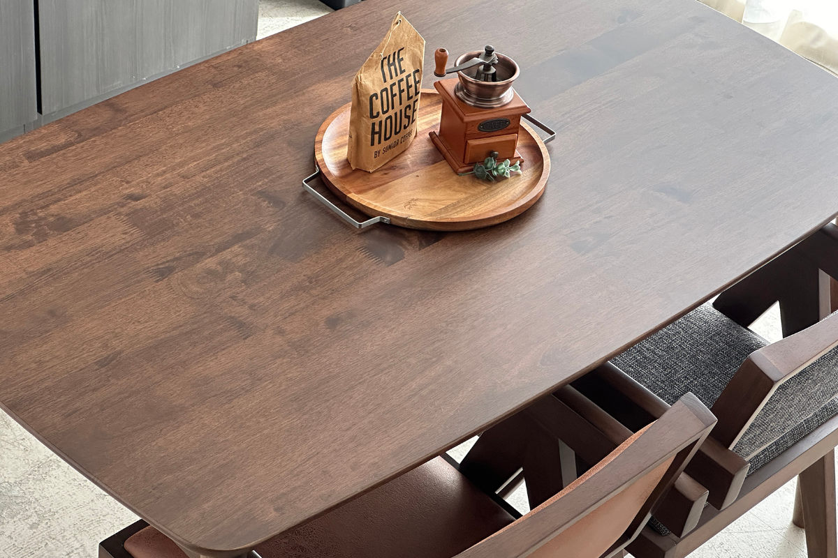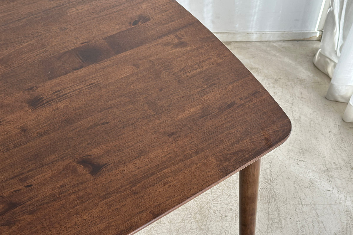 テーブル全体にラバーウッド無垢材を使用しています。こっくりとしたブラウンに深みのある木目が美しく、食卓映えするテーブルです。